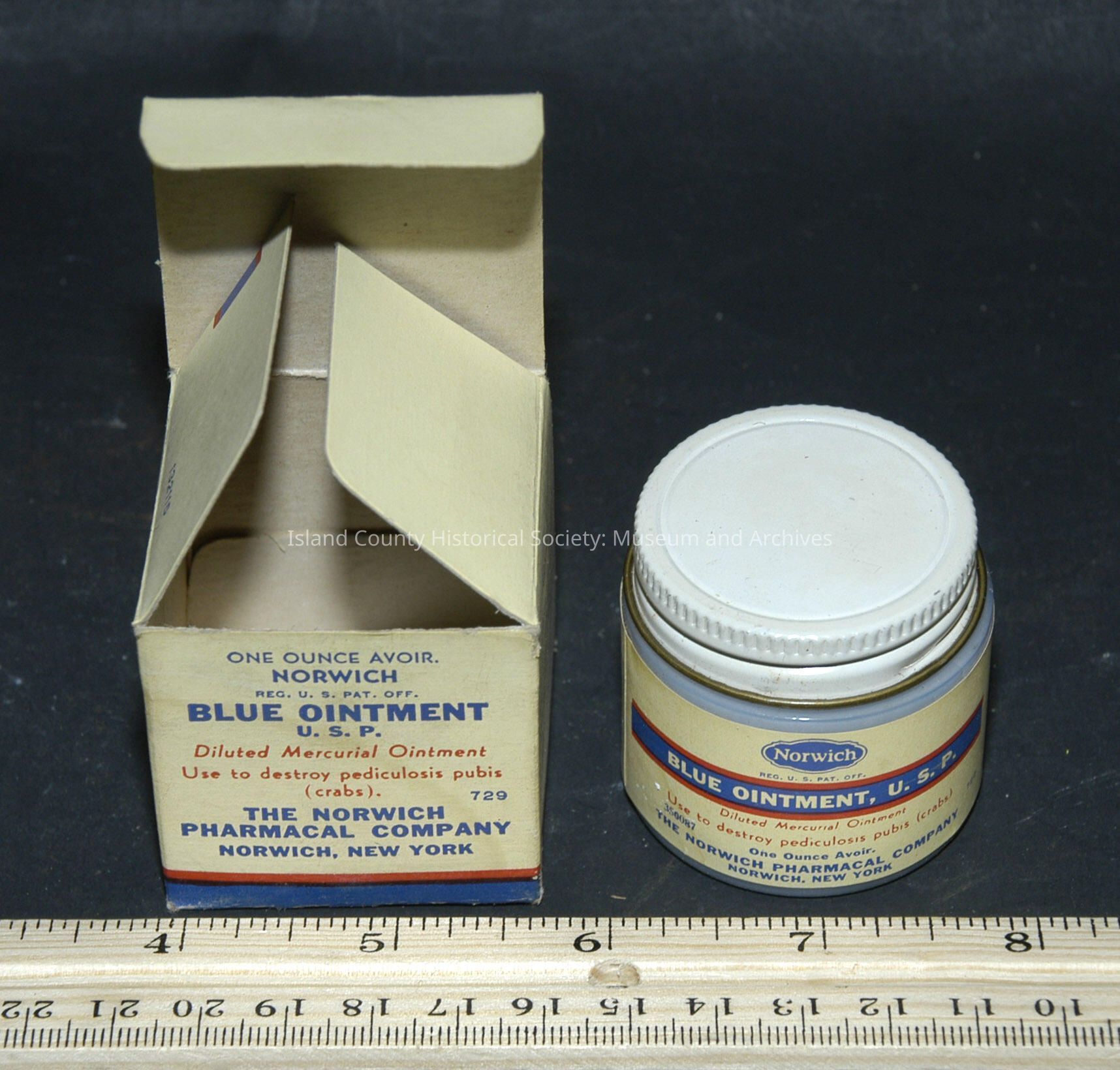 white jar in box 1 5/8" with cap - Norwich - Blue Ointment U.S.P. - salve - full
