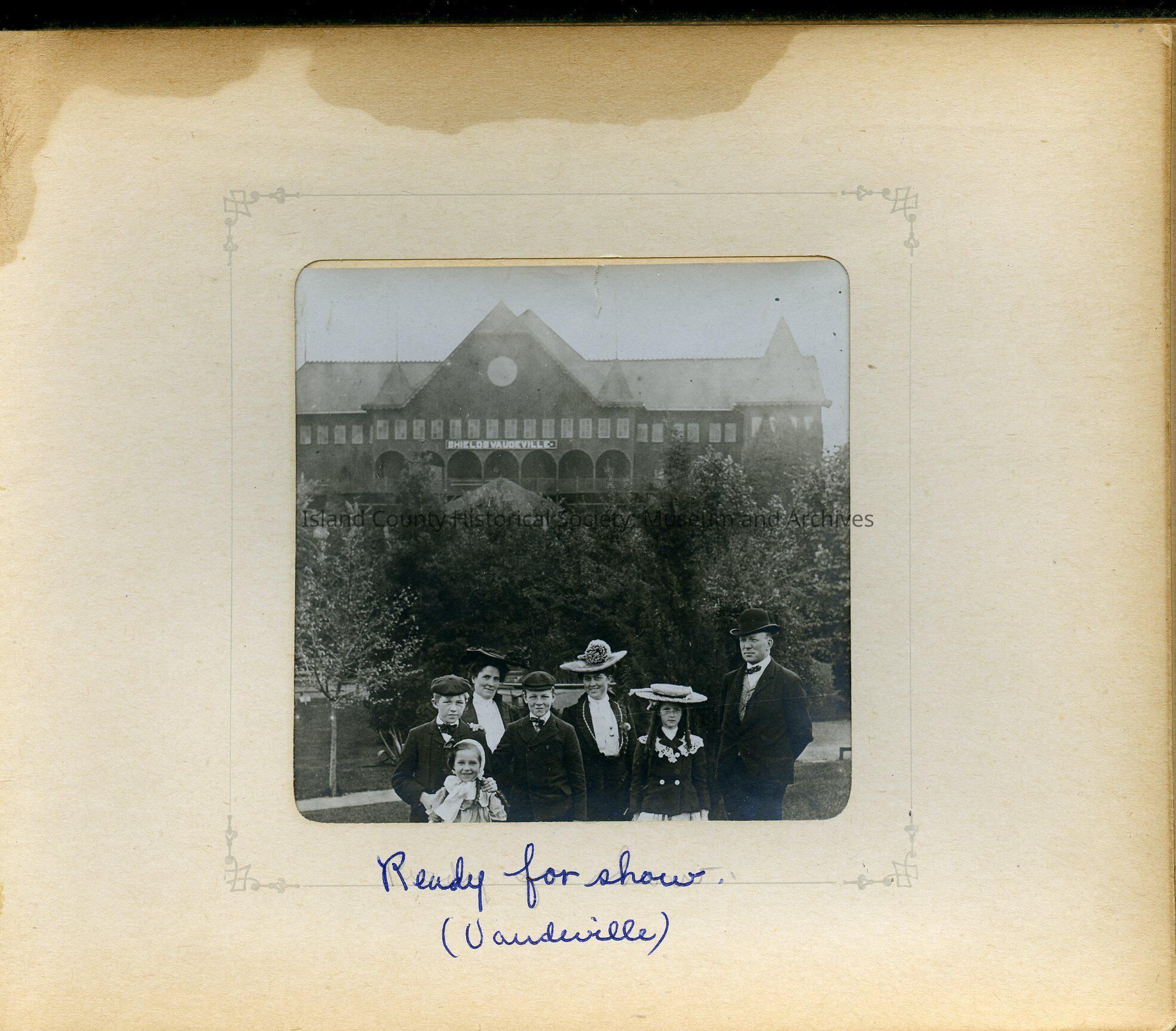 A group of one man, two women, and 4 children, very well dressed, stand in front of a large building with large porch and towers. A sign reads: Shields Vaudeville. Note reads: Ready for show (Vaudeville)Made/Created