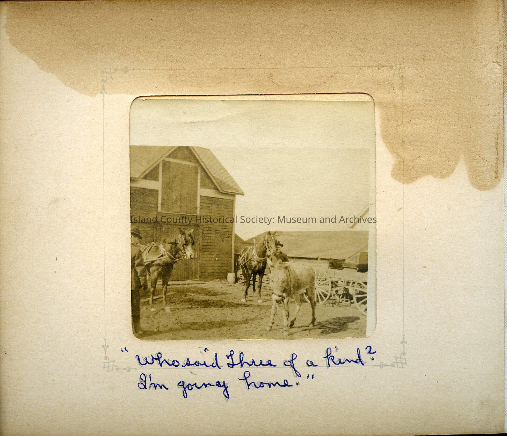 Two horses and a donkey in front of a barn. Two men and a wagon. Note reads: "Who said Three of a kind? I'm going home."