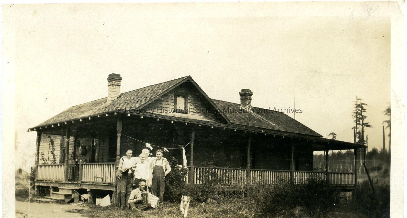 Autio house exterior with five men (or four men and one woman), four of which stand and one sits on the grass. A small dog is to the right. The man sitting holds an accordion whilst the standing man furthest left holds a lute/guitar-like instrument. The young man in the middle is Walter Autio (very blond hair)