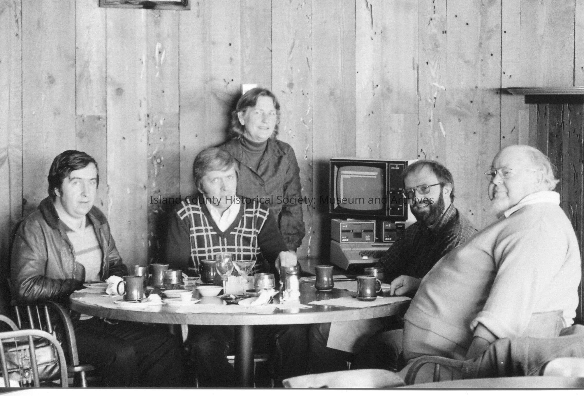 Black and white photo of Richard Priesing (owner of print shop), Sylvia Folkart, Steve Ernest, and 2 other unidentified males sitting at table. Context of picture is unknown was found in an envelope labeled Ron VanDyk the museum.