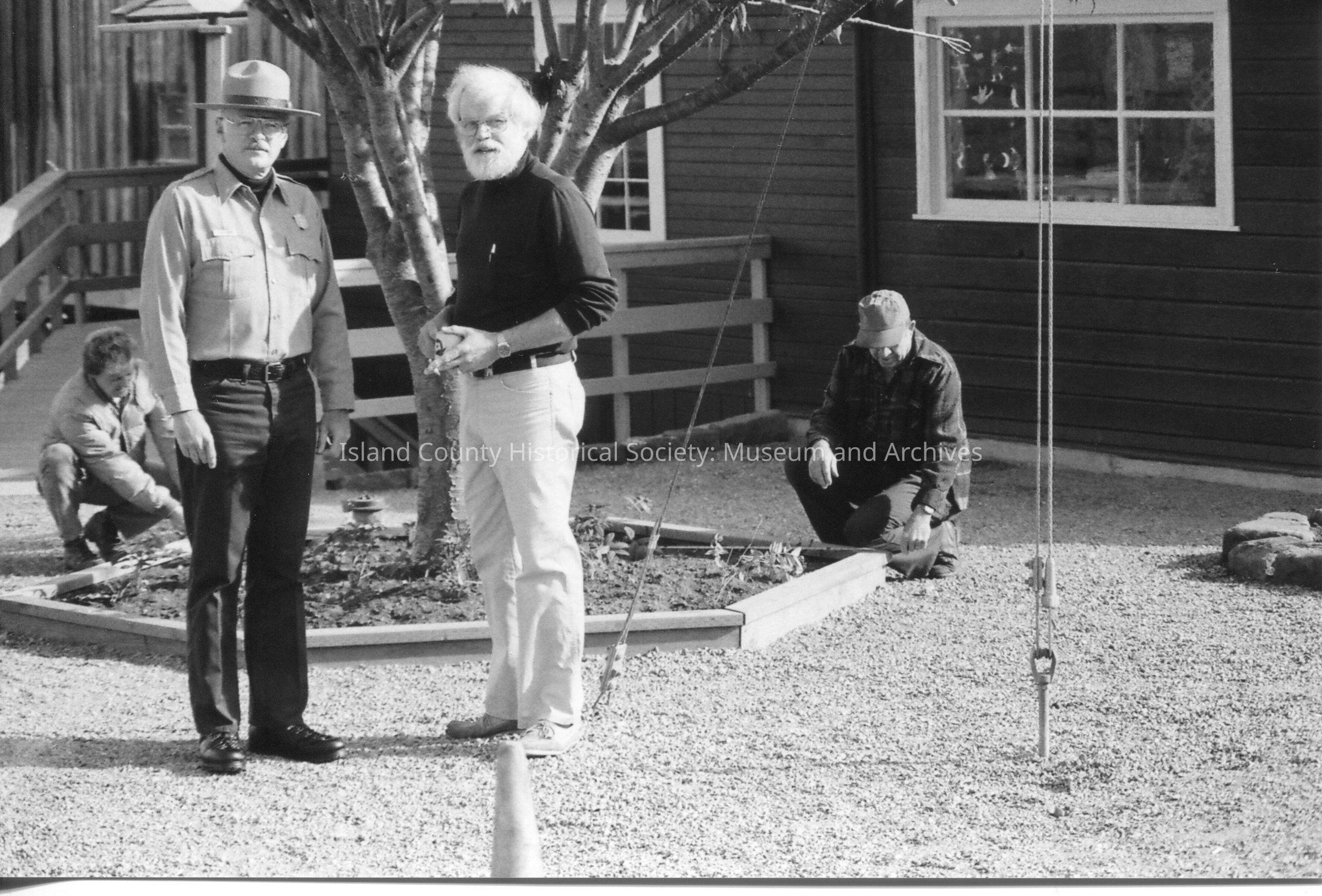 Black and white photo of Reed Jarvis and Dick Wieringa standing in front of a landscaped tree in the wharf courtyard. Context of picture is unknown was found in an envelope labeled Ron VanDyk the museum.