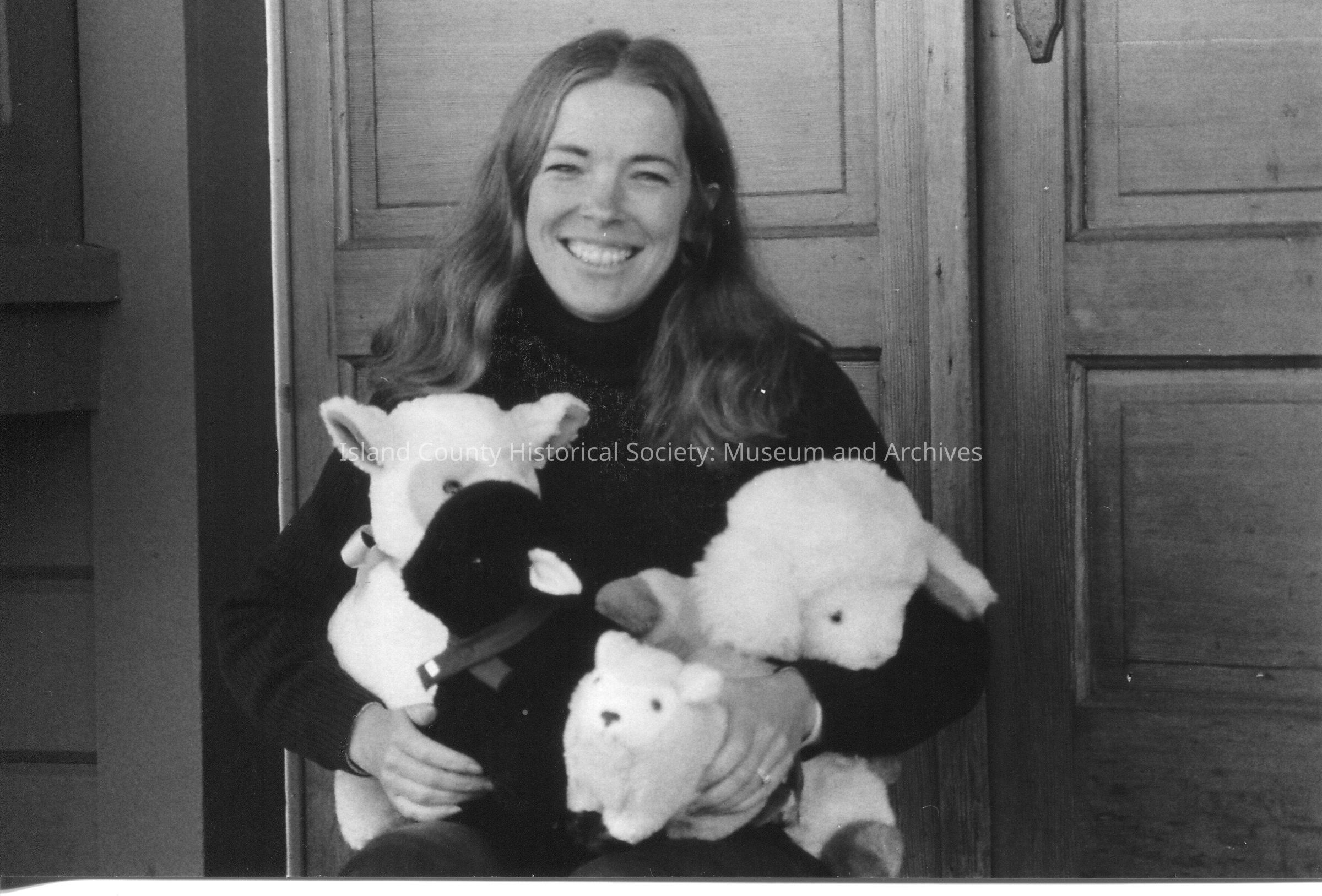 Black and white photo of Lee Anderst owner of Coupeville Spinning and Weaving shop on Front Street. In the photo Lee is holding several stuffed sheep while standing in front of wood double doors. Context of picture is unknown was found in an envelope labeled Ron VanDyk the museum.Lexicon