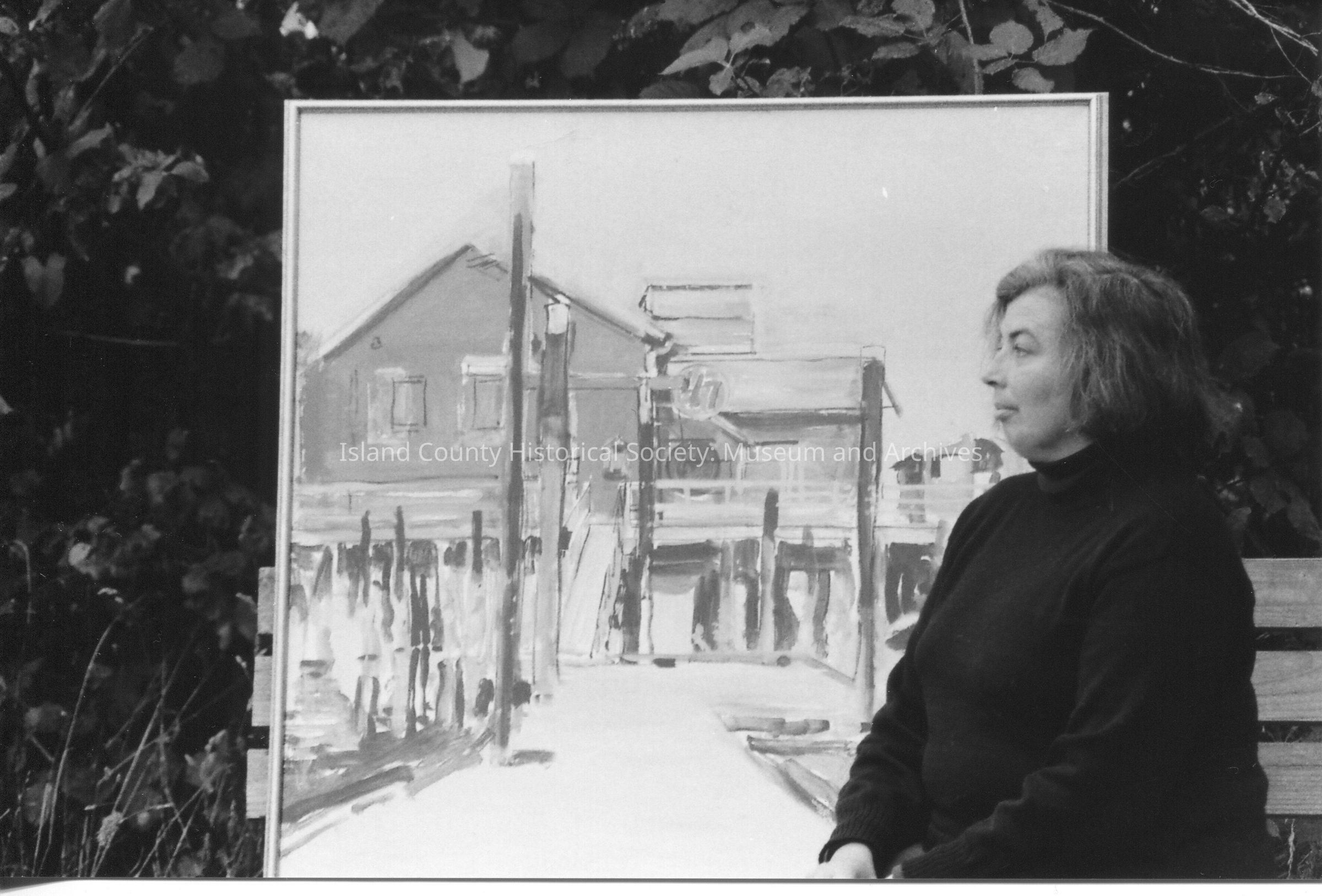 Black and white photo of Beatrice Powell and her painting of Coupeville. Context of picture is unknown was found in an envelope labeled Ron VanDyk the museum.