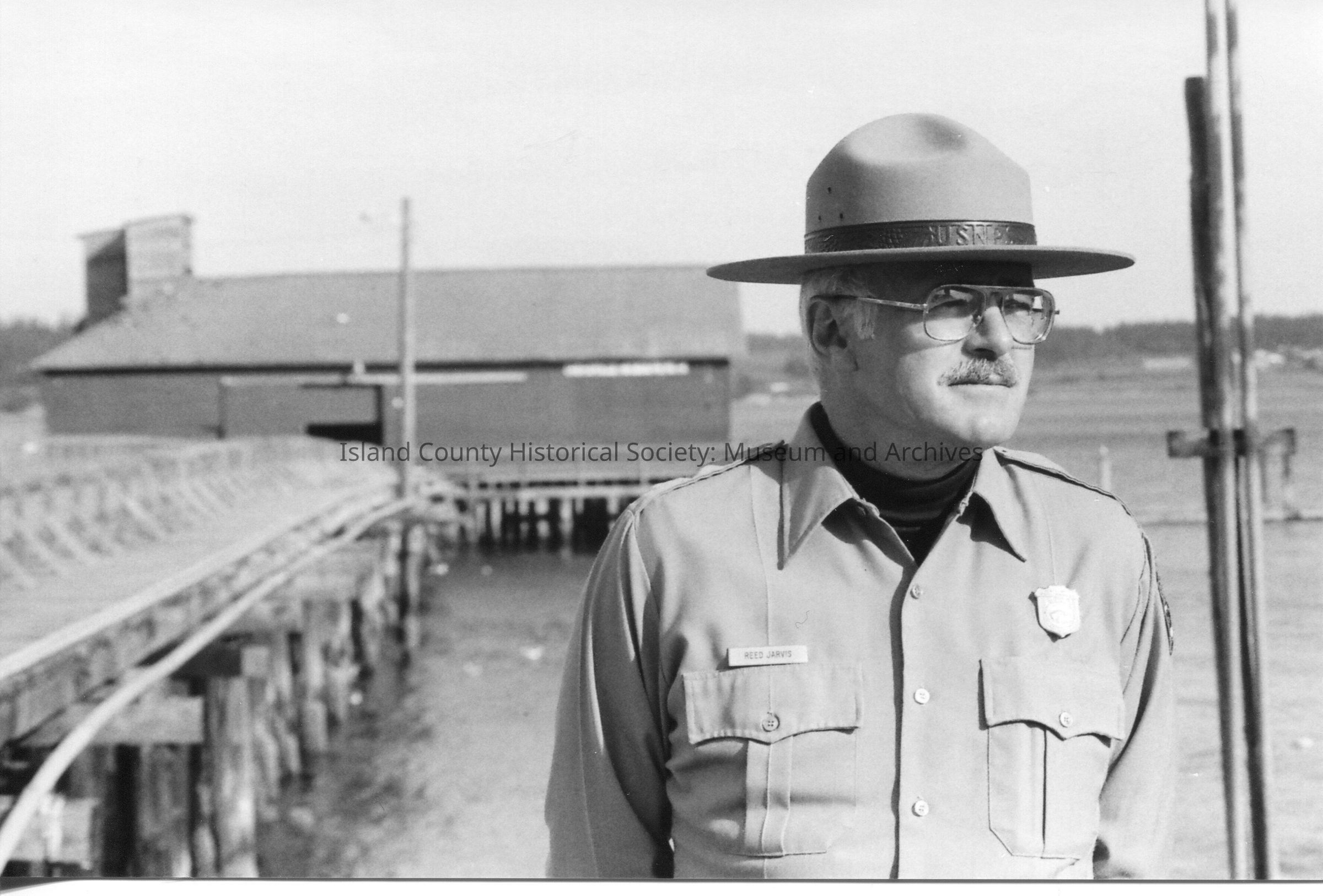 Black and white photo of Reed Jarvis standing in front of the Coupeville wharf. Context of picture is unknown was found in an envelope labeled Ron VanDyk the museum.