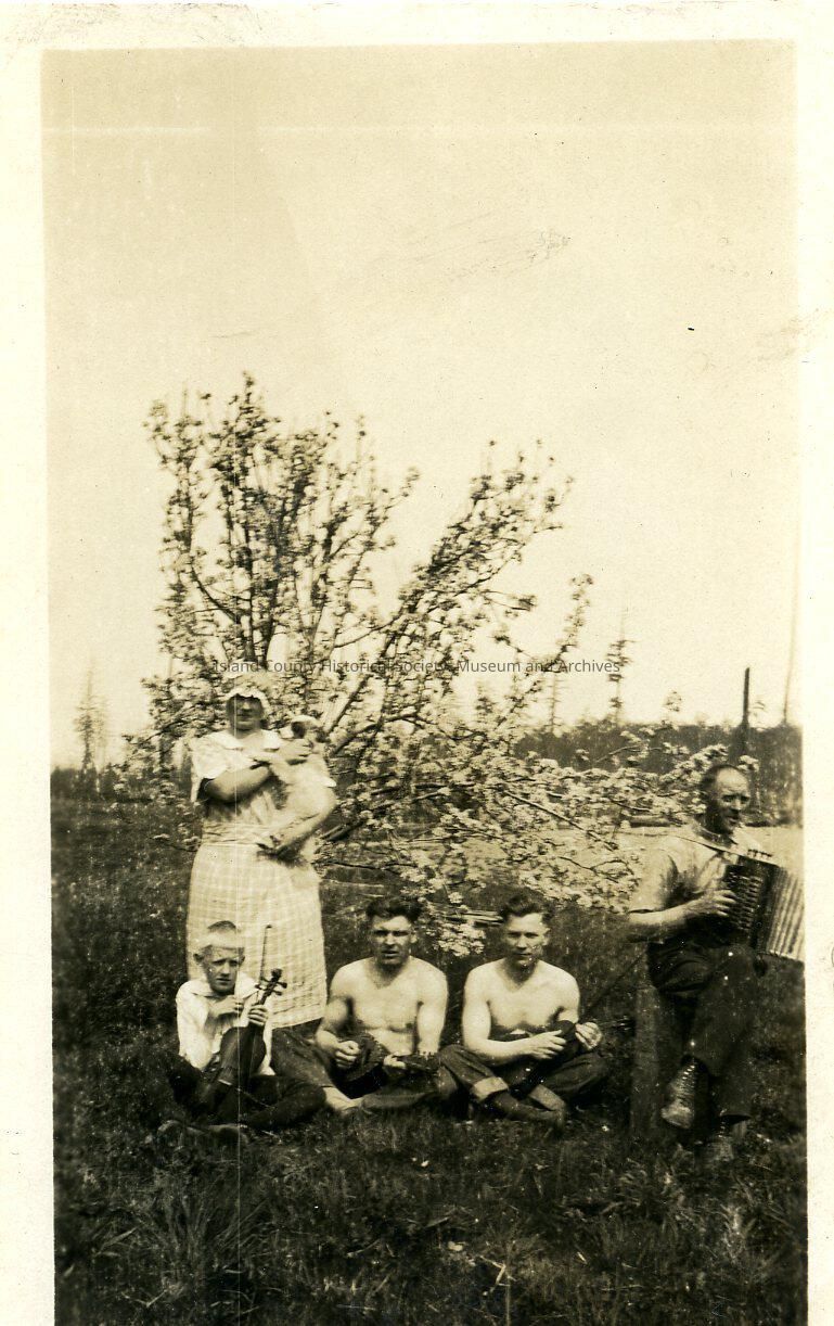 Mary Autio, young Walter Autio, Fred Stark, Otto Heino and Eli Autio holding instruments whilst posing for the camera in front fof a tree. Mary holds a dog, Eli holds the accordion, Walter and Otto hold fiddles and Fred holds a guitar-like instrument.Lexicon