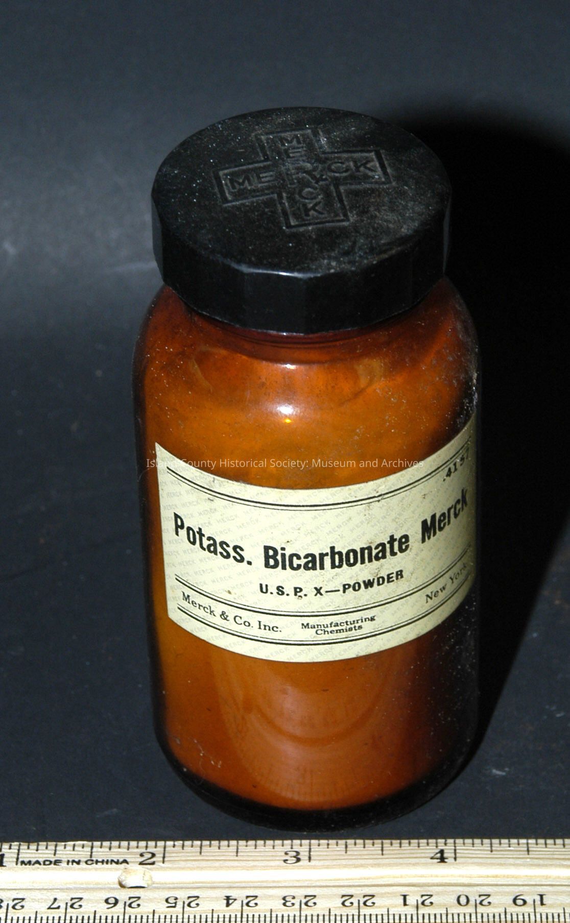 brown 4 1/2' bottle with plastic screw cap full Merck-Potass. Bicarbonate U.S.P.X. - Powder