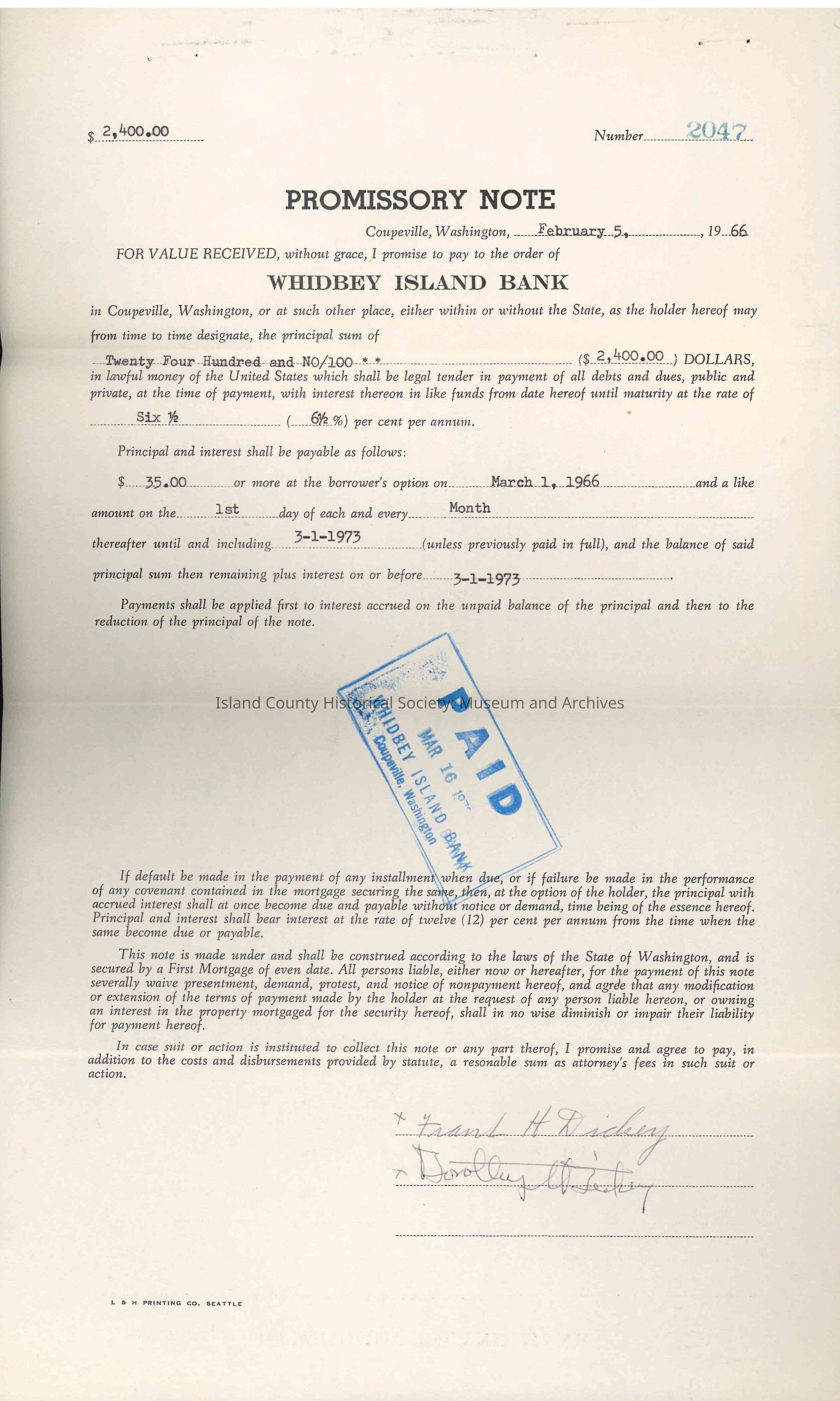 Promissory Note issued to Frank and Dorothy Dickey from Whidbey Island Bank, at the principal sum of $2,400.00 at an interest rate of 6.5% per annum. Dated 05 February 1966.