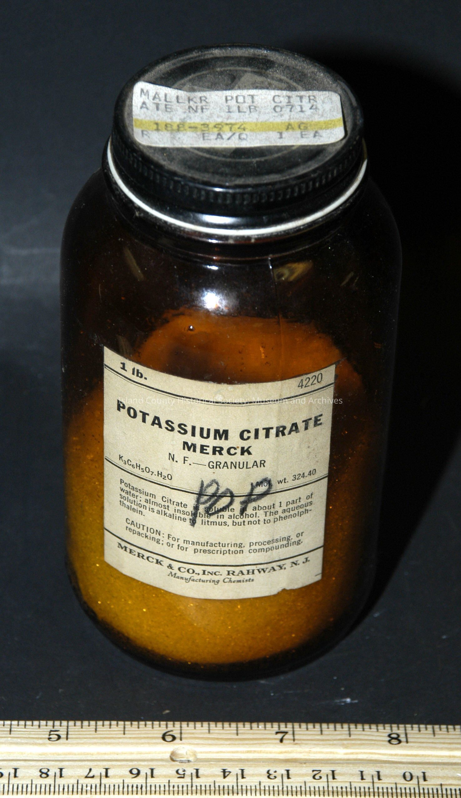 brown 5 1/4" bottle with metal screw cap 1/2 full Merck - K3C6H5O7H2O (chemical formula) Potassium Citrate N.F. Granules