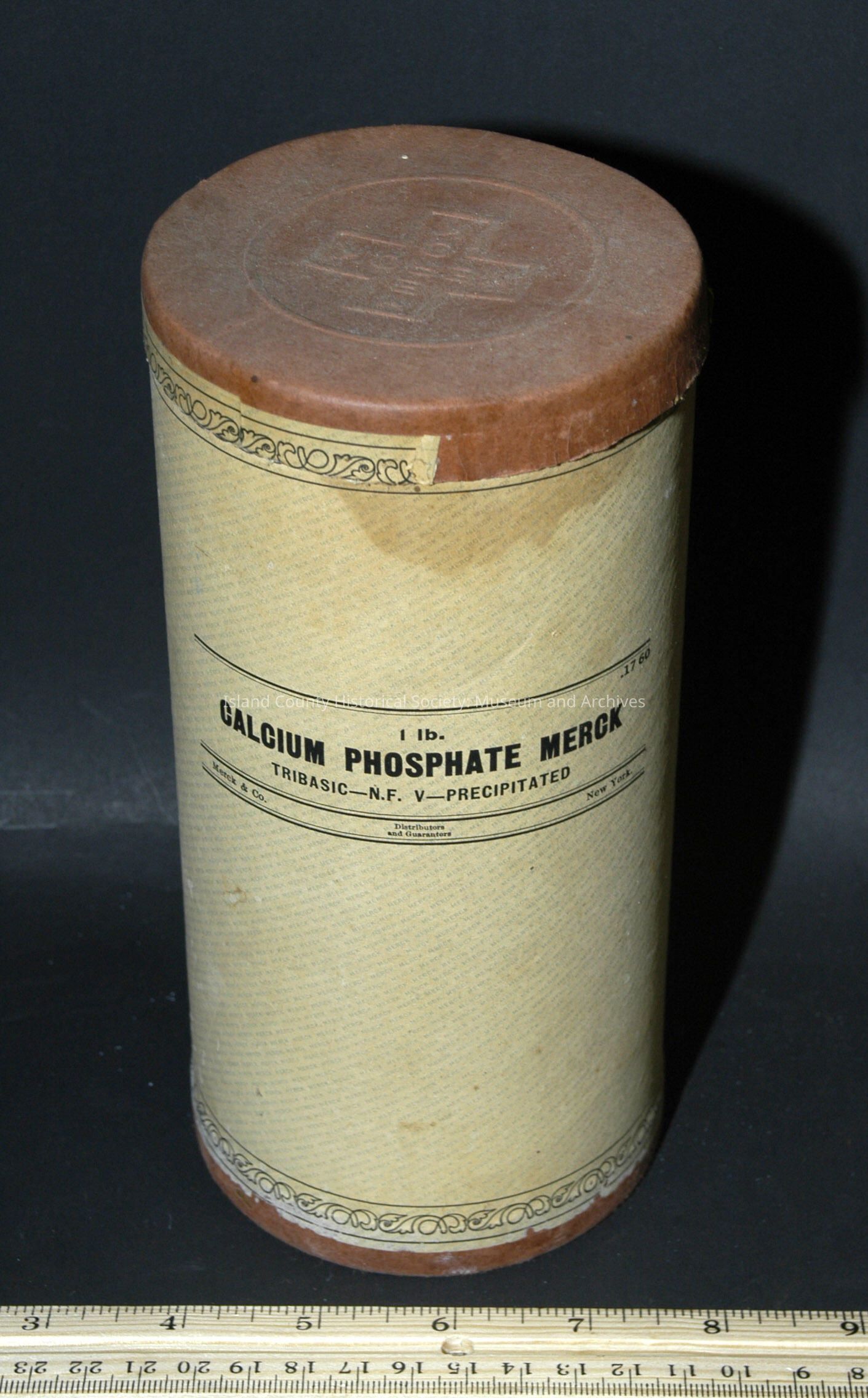 paper box - Round - 7 3/4" x 3 3/4" diameter - Merck - Calcium Phosphate - powder 1/2 full