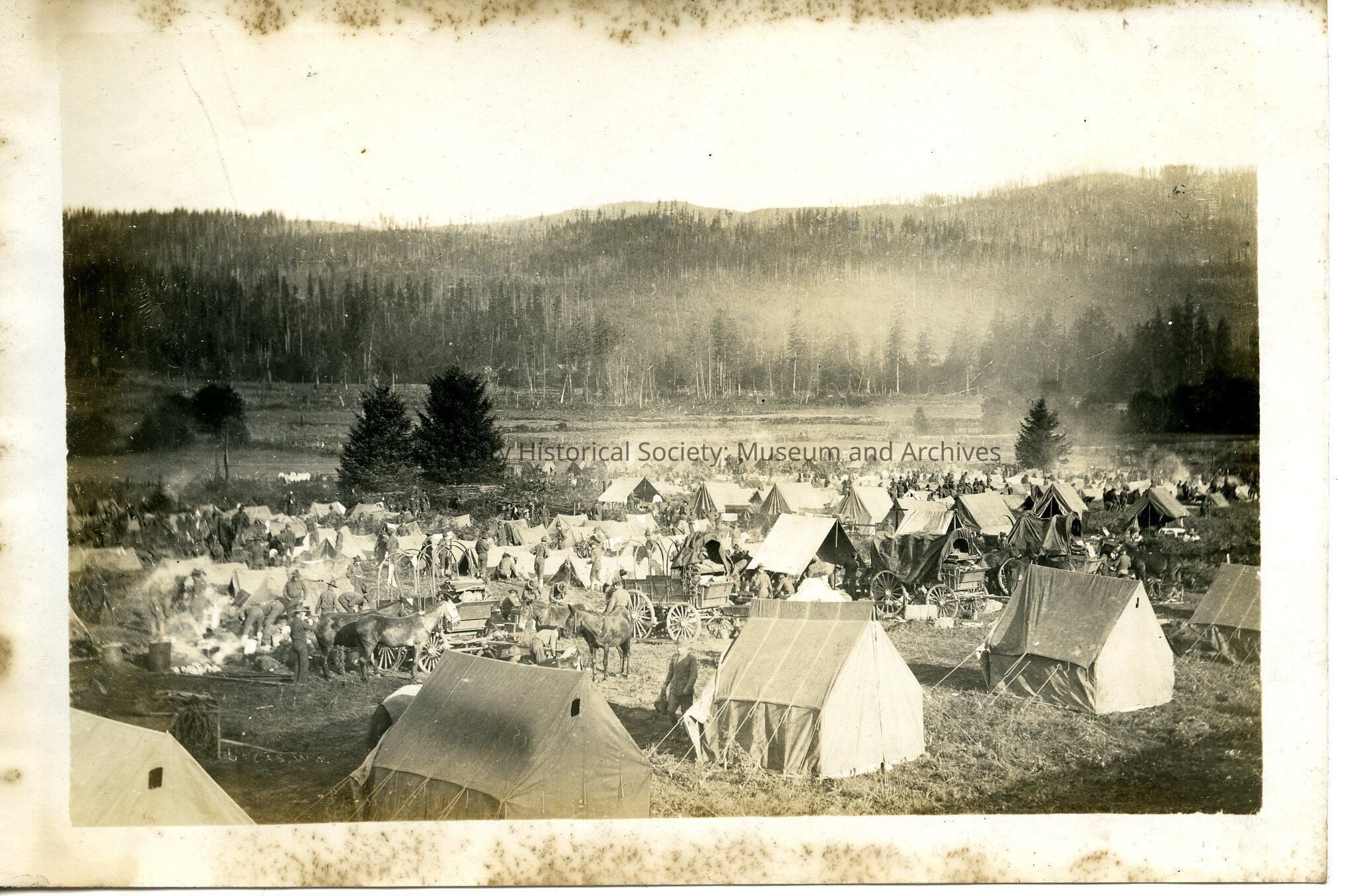 Written on front photo cover it states: "Uncas WA". Photo shows a large encampment with numerous tents, horses, and wagons in an open meadow area with trees and wooded ridgeline in the back ground at the top of the photo. Shows several tents and shelters pitched.