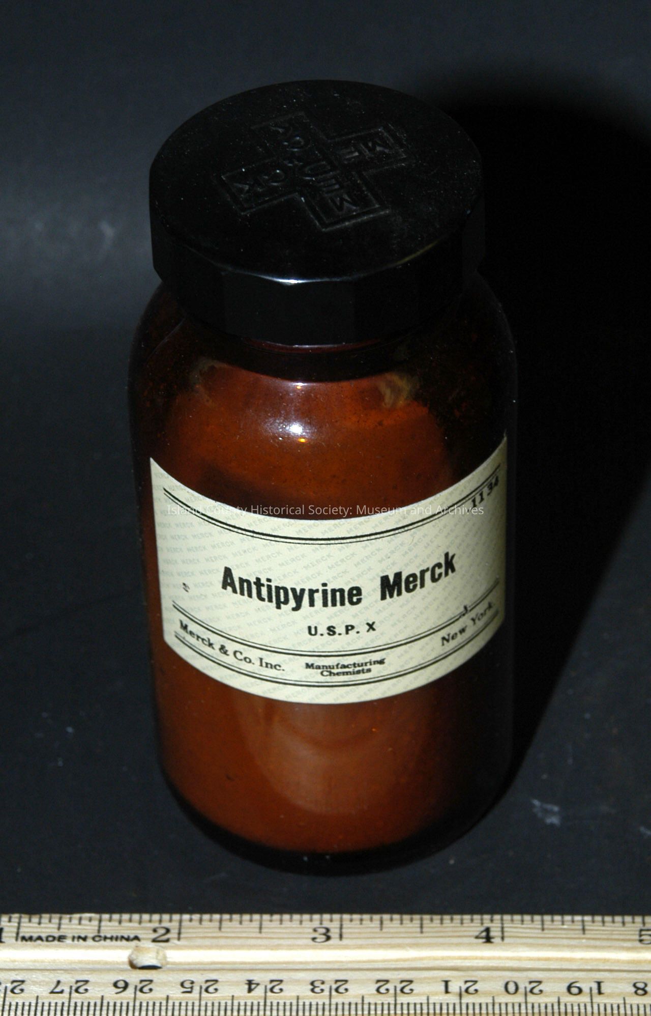 brown bottle 4 1/2" with cap - Merck - Antipyrine - crystals, 1/2 full