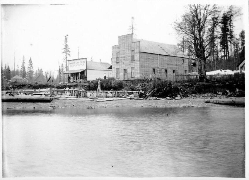 View of two storefronts including the Harbor Cash Store taken from across a body of water. From the Pete Hurd Collection. Charles Hurd Photo 1910.