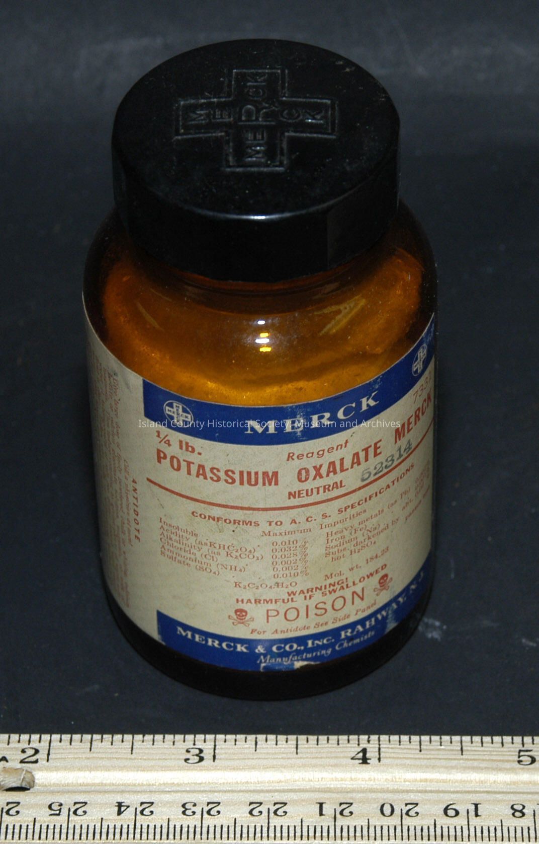 brown bottle 3 1/2" with cap - Merck - Potassium Oxalate - crystals, 3/4 full