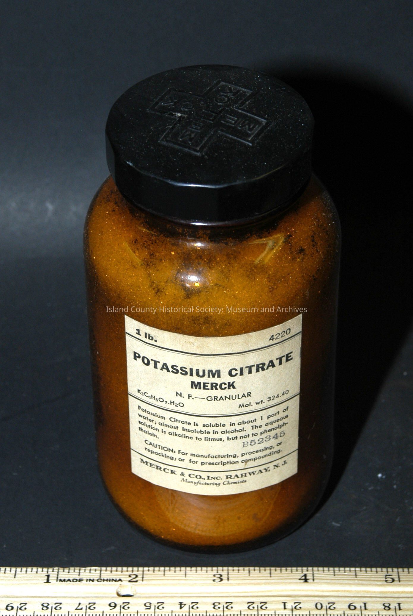brown bottle 5 1/2" with cap - Merck - Potassium Citrate, crystals, 3/4 full