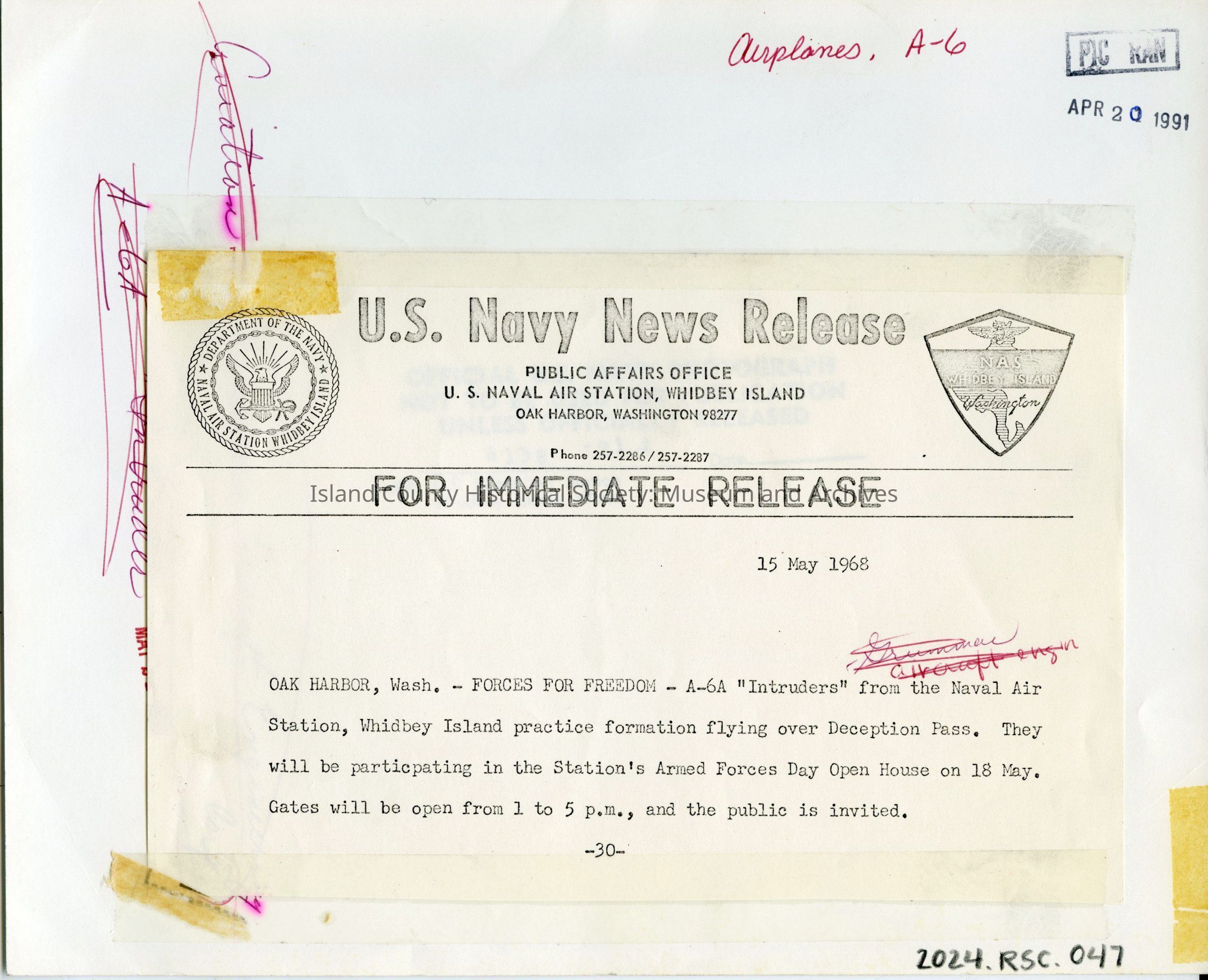 On back: "Oak Harbor, WA - Forces for Freedom - A6A Intruders from NAS Whidbey flying over Deception PassPhotograph Details
