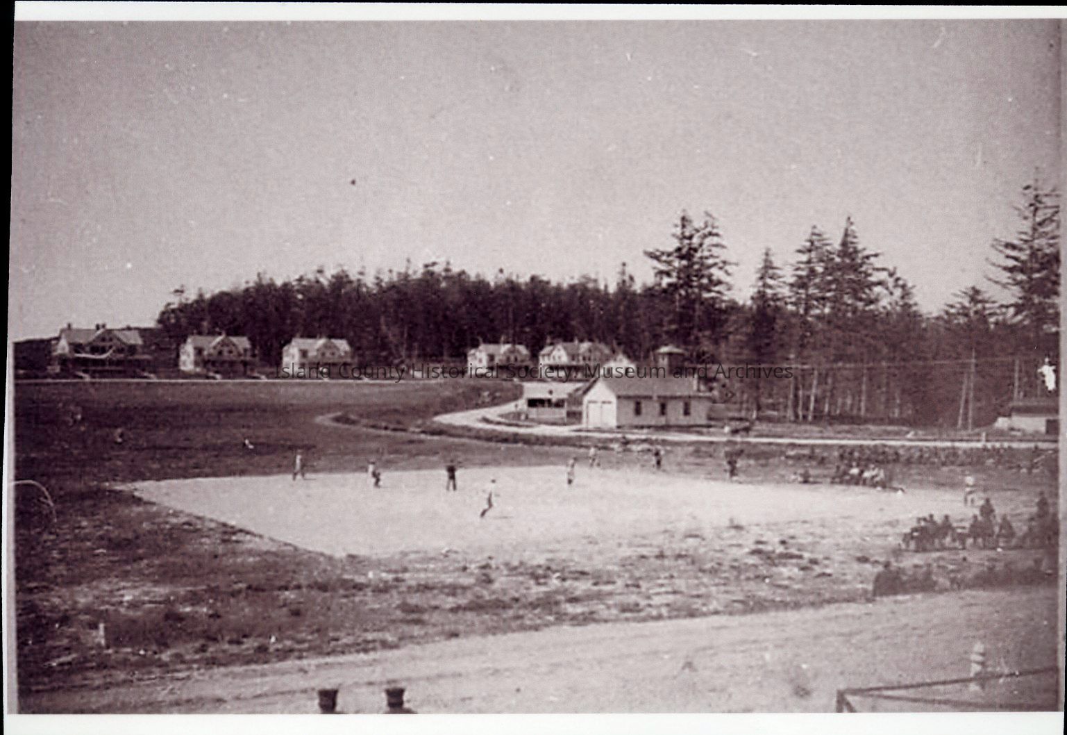 Photograph of a game of baseball being played in the parade grounds at Fort Casey.Photograph Details