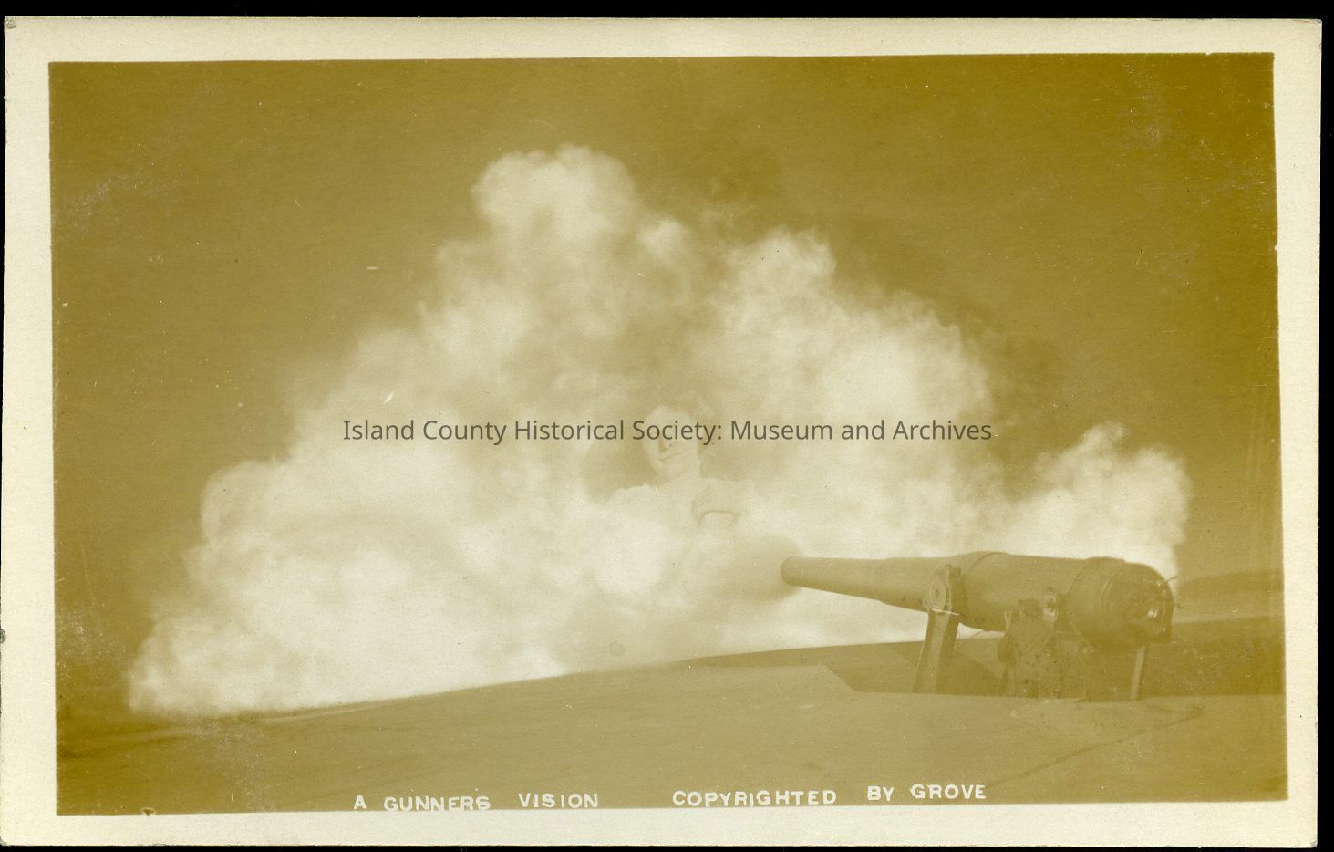 Postcard captioned "A Gunner's Vision", dated 1913. Depicts an image of a woman in the smoke of a 10" disappearing rifle's fire at Fort Casey. Copyrighted by "Grove".Collection