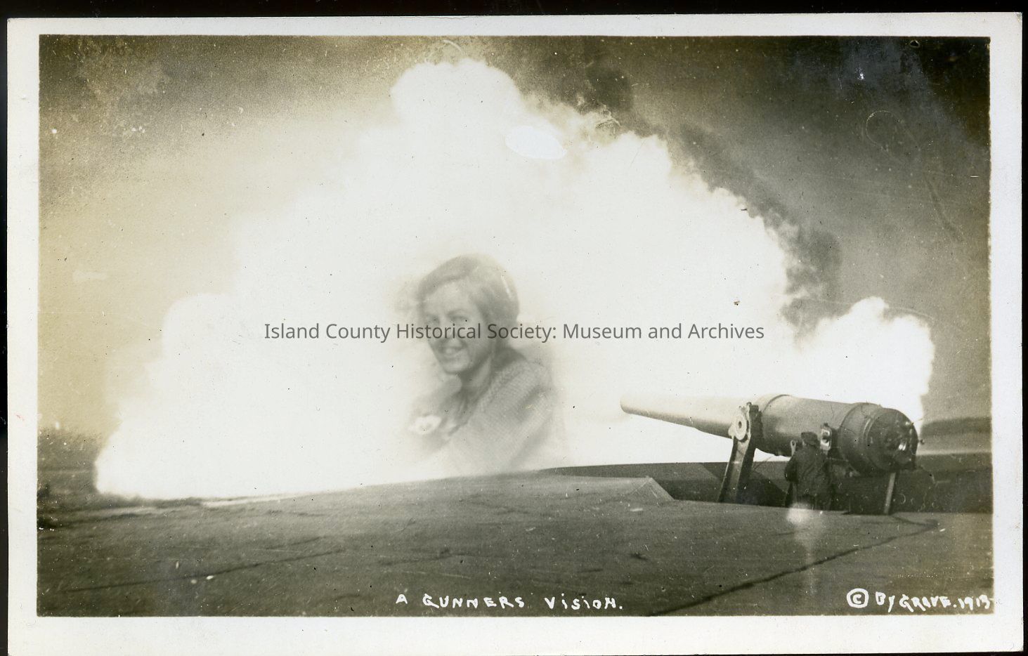Postcard captioned "A Gunner's Vision", dated 1913. Depicts an image of a woman in the smoke of a 10" disappearing rifle's fire at Fort Casey. Copyrighted by "Grove".Collection