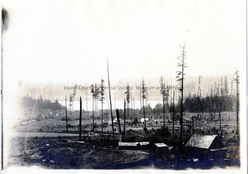 Unidentified area of Whidbey Island, 1910, showing a thinned out forest with several small shack homes.