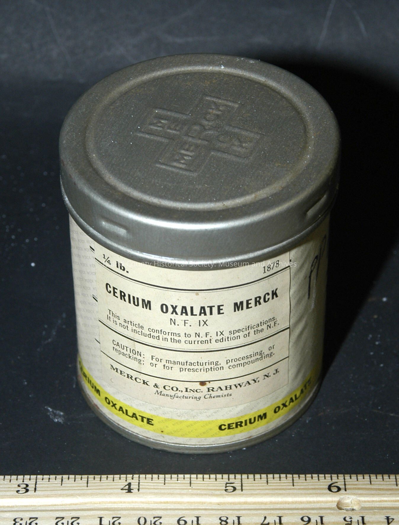 can - metal - 3" x 2 1/2" diameter with lid - Merck - Cerium Oxalate - powder, full