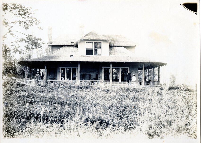 Front view of home built by W.B. Hurd with wrap around porch and large overgrown yard in front.