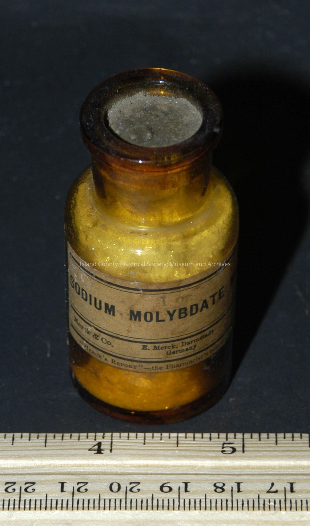 brown bottle 2 1/2" with cork - Merck - Sodium Molybdate, crystals, full