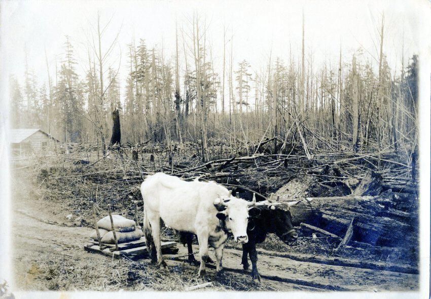 Two cattle pulling a pallet loaded with full sacks at the W.B. Hurd homestead "Dad's homested (sic) w.B. Hurd Whidby Island W. B. Hurd 1910 Charles Hurd Photo" "W.B. Hurd is my Granddad Pete Hurd"