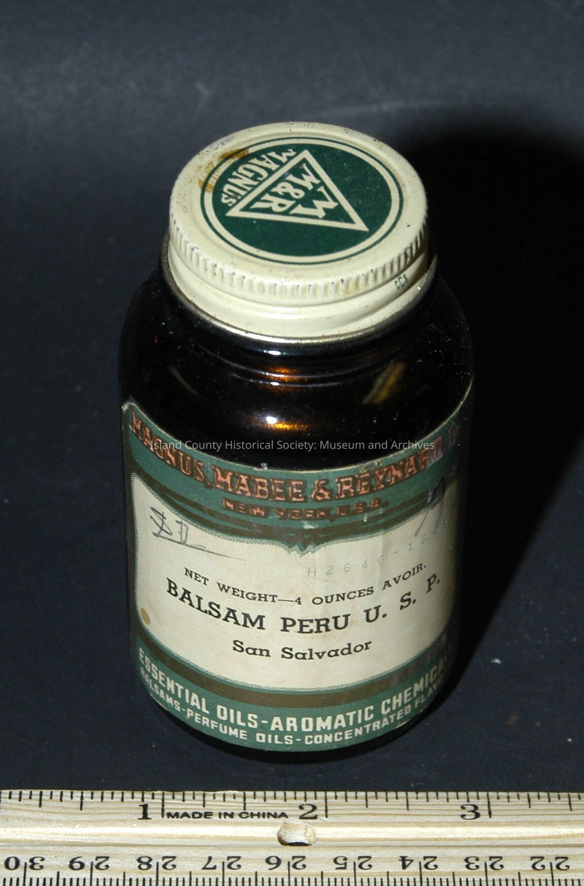 brown bottle, 3 1/2" with cap; Magnus, etc. - Balsam Peru U.S.P.; liquid, 1/2 full