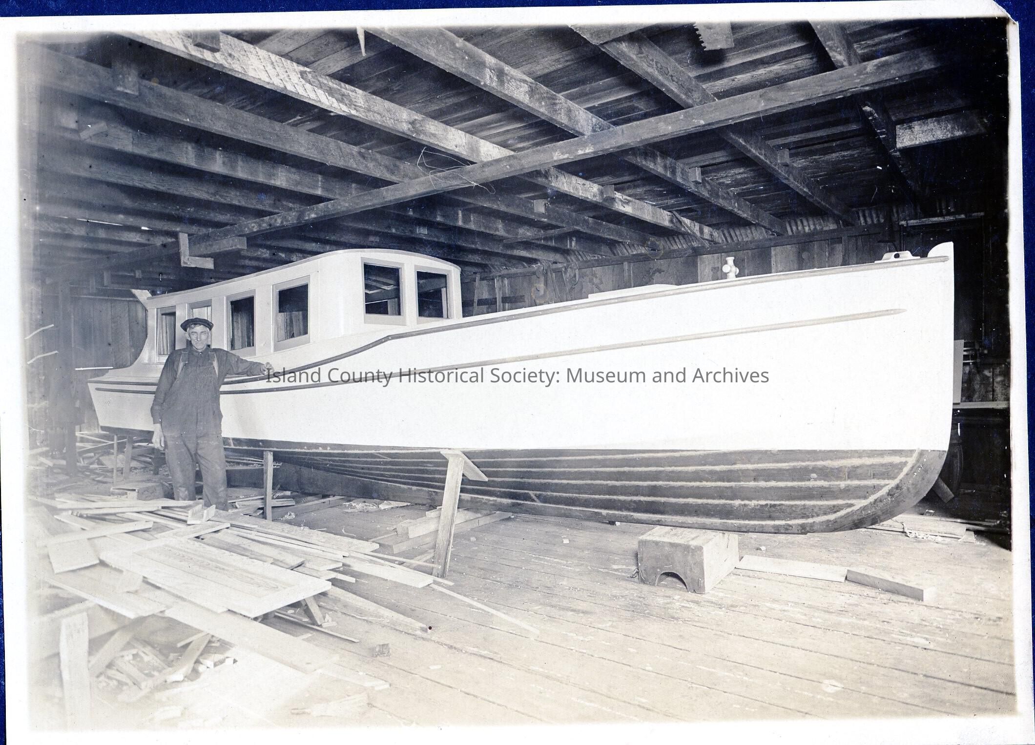 Mr. Horace Holbrook, builder standing next to Frank J Pratt's boat inside Horace's barn.