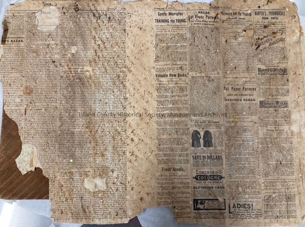 Pages from February 8, 1872 Harper's Bazaar newspaper used as wallpaper in Power's house, San De Fuca