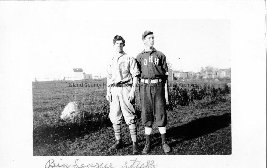 Harold and Ted Hill standing in a field wearing baseball uniforms. Bottom of postcard reads "Big League Stuff"