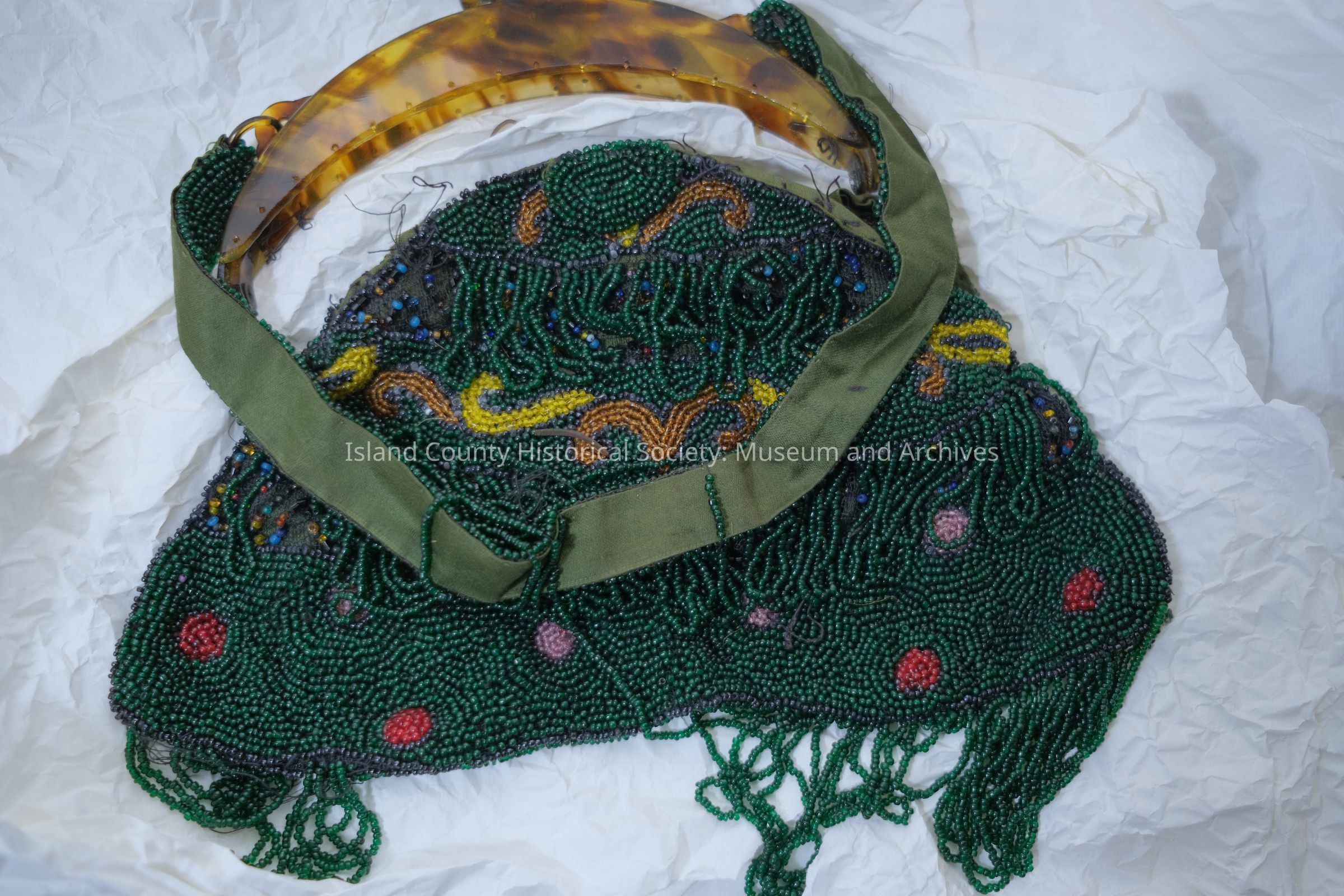 green beaded evening bag w/ celluloid handles, multi color embelliments throughout