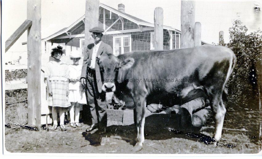 Harvey Hill standing with his cow Bess and his two daughters Phyllis and Lorette AZO postcard dated 1910-1930.