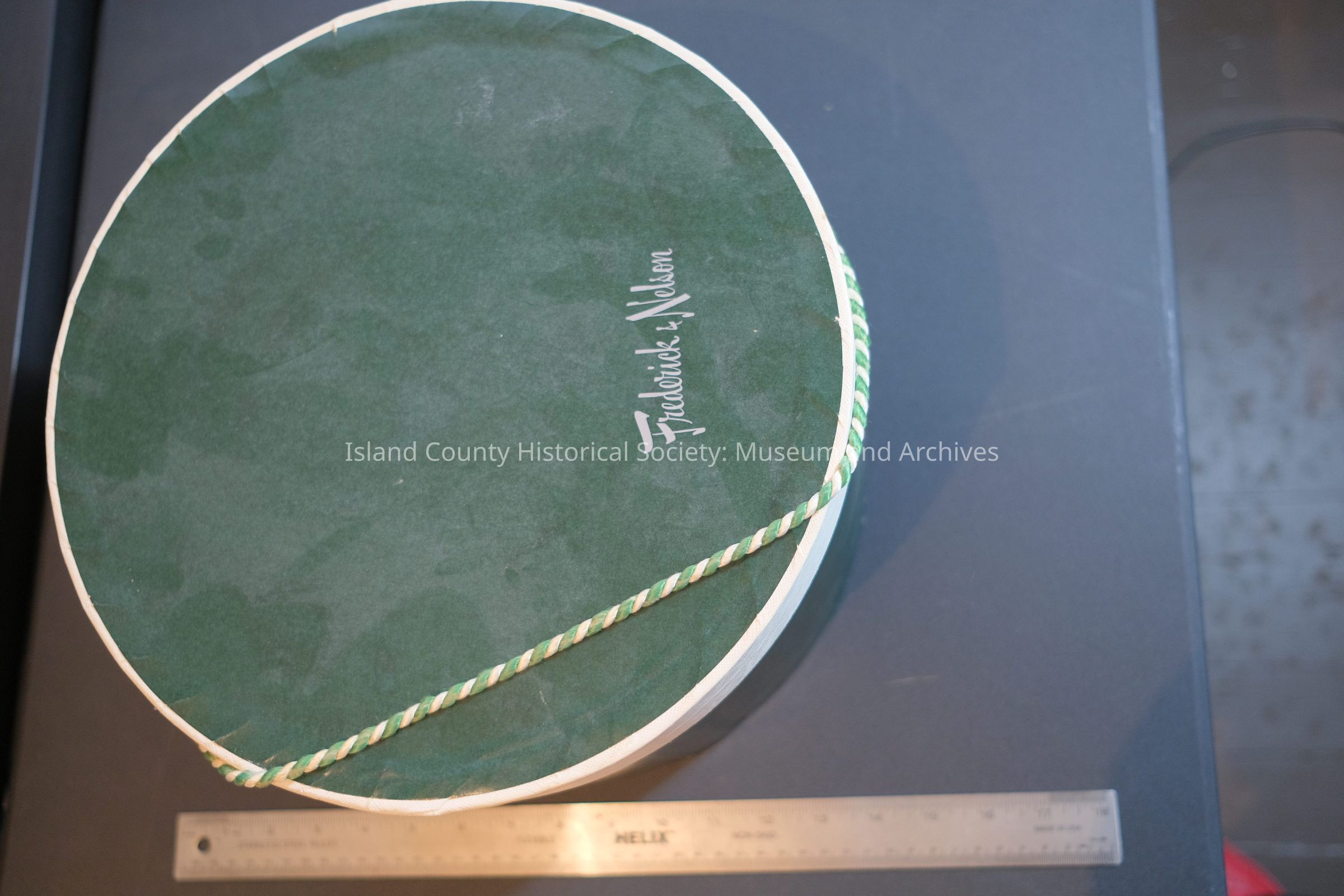 dark green w/ white accent Frederick & Nelson hatbox, empty