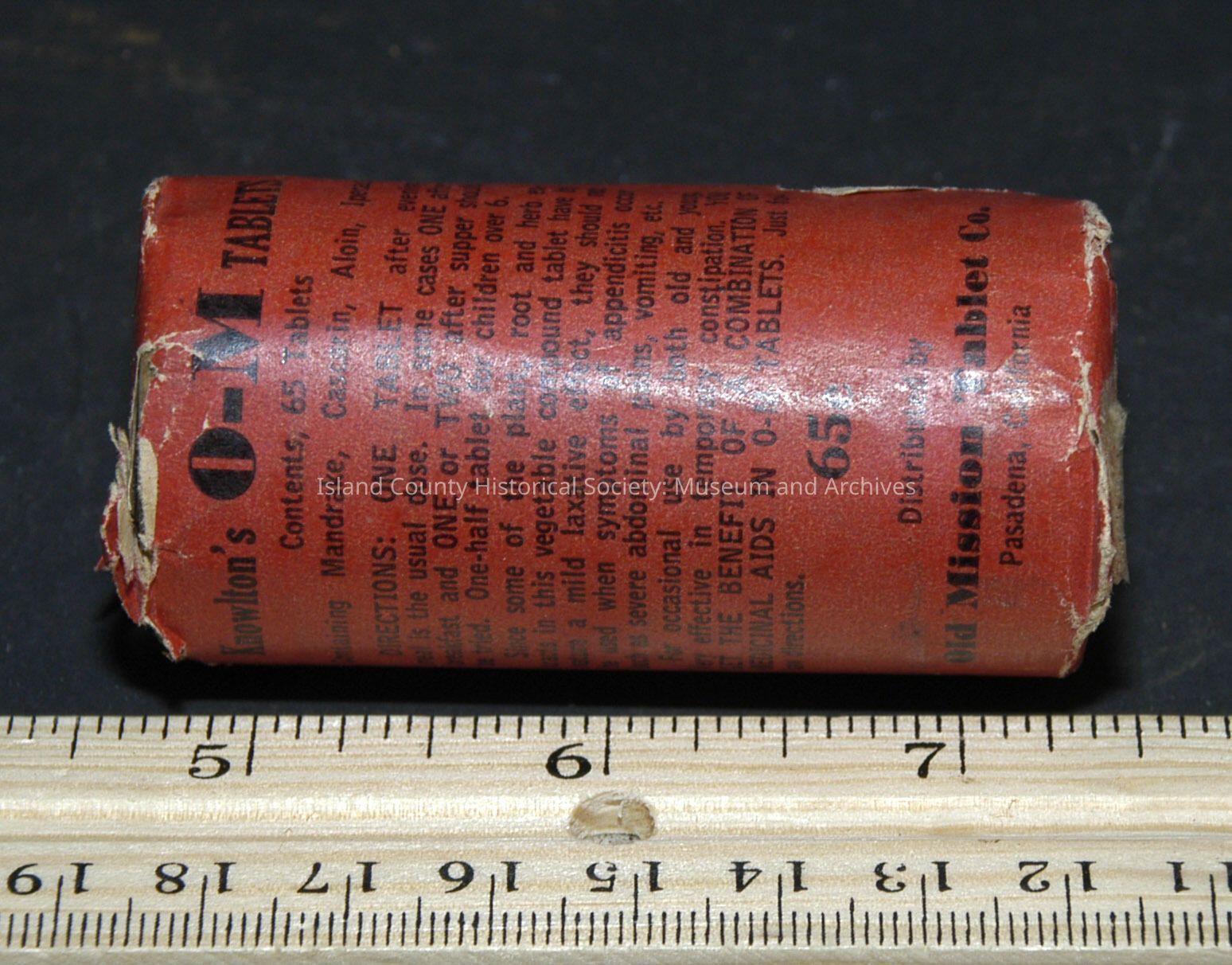 paper box 2 5/8" wrapped in paper, Old Mission, Knowlton's O-M Tablets, pills, full