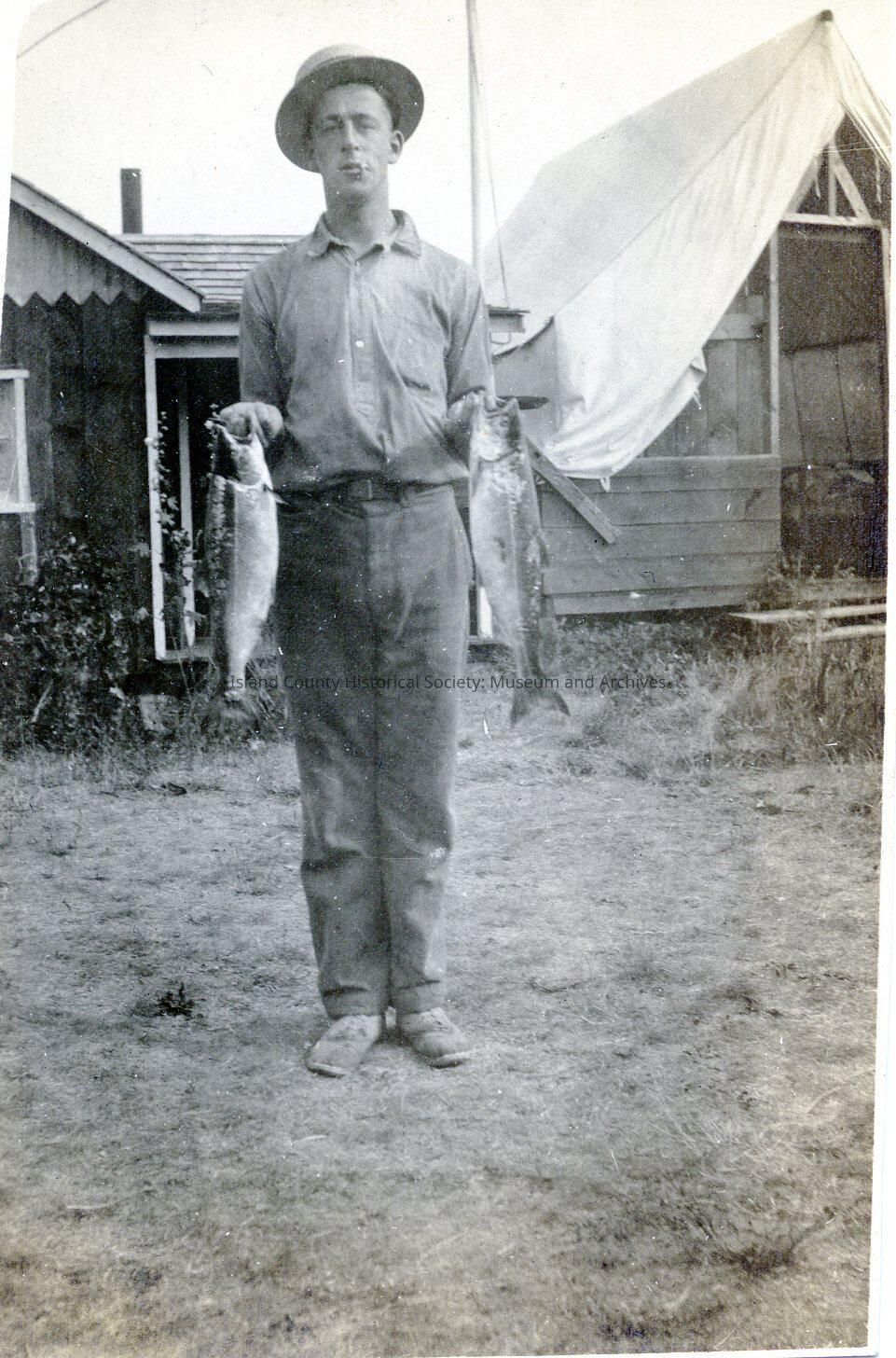 Possibly Ted Hill standing in front of a tent and house holding two fish.