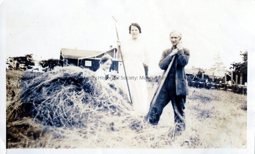 Group photo of Harvey and Daisy Hill, and possibly Loretta Hill? All are posed next to a big pile of hay. Harvey and Daisy are holding tools. .