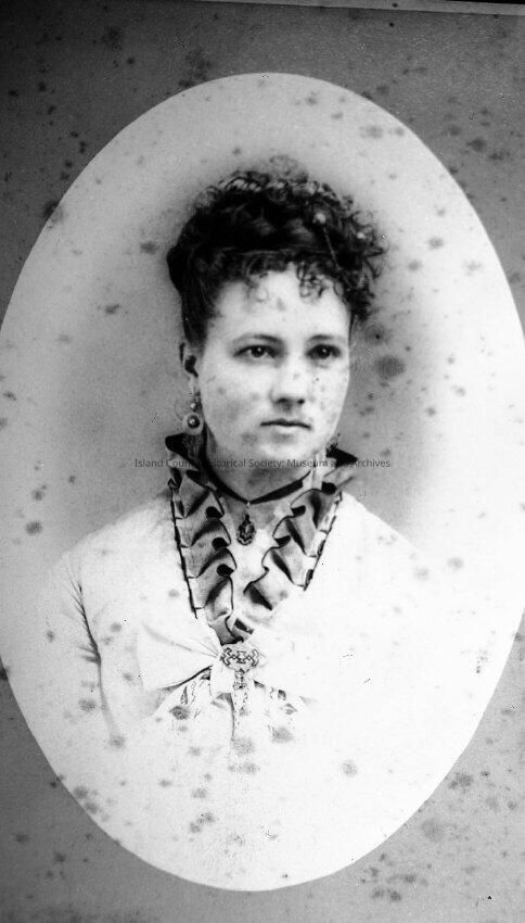 Portrait of Elizabeth Phillips Hill wearing a collared dress and her hair styled up.Made/Created