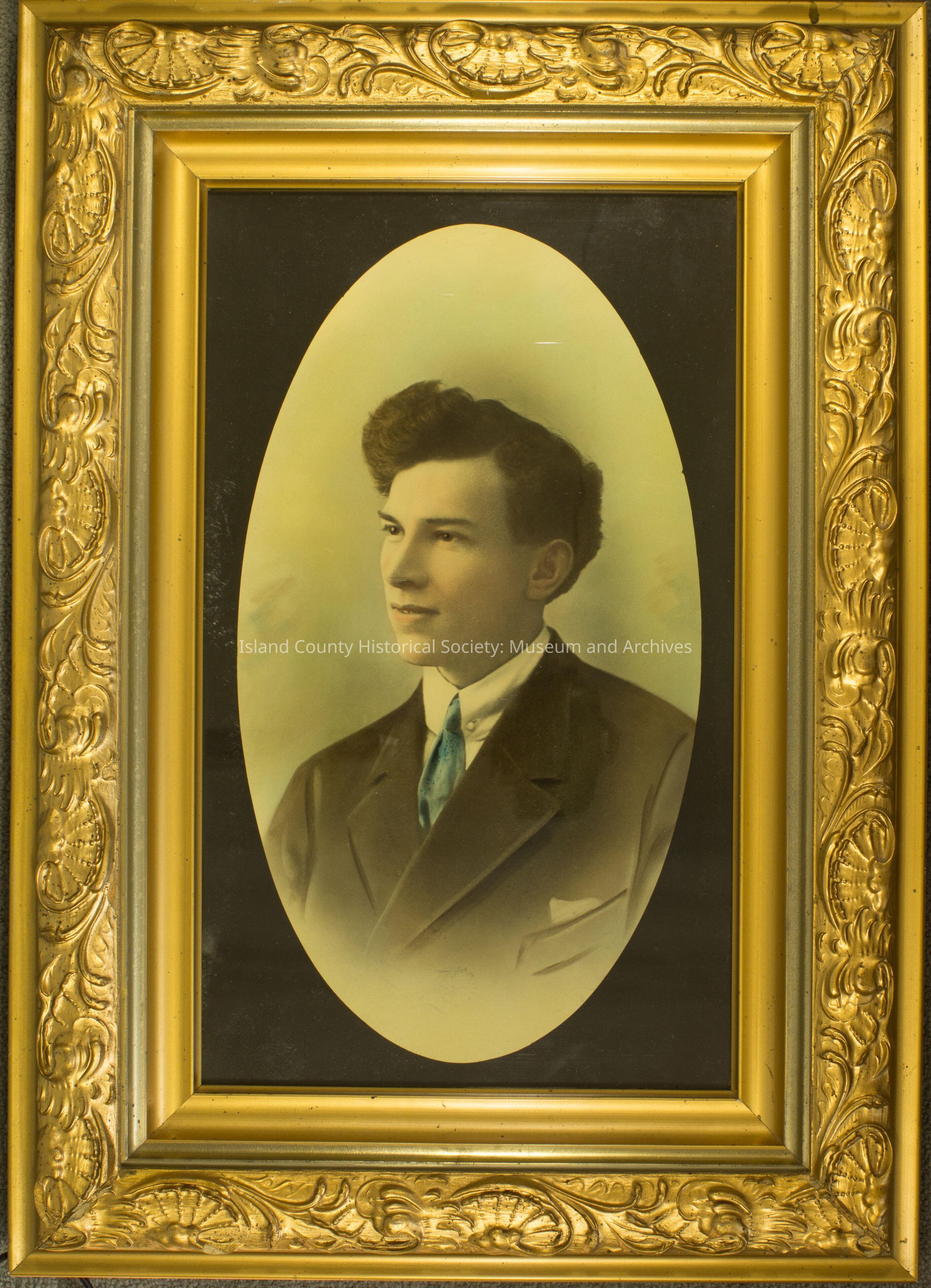 Gold framed color portrait of Vernon Coates. The portrait appears to be enclosed within an oval shaped - black mat. In the photo Vernon is wearing a blue tie and a suit with white napkin pocket.