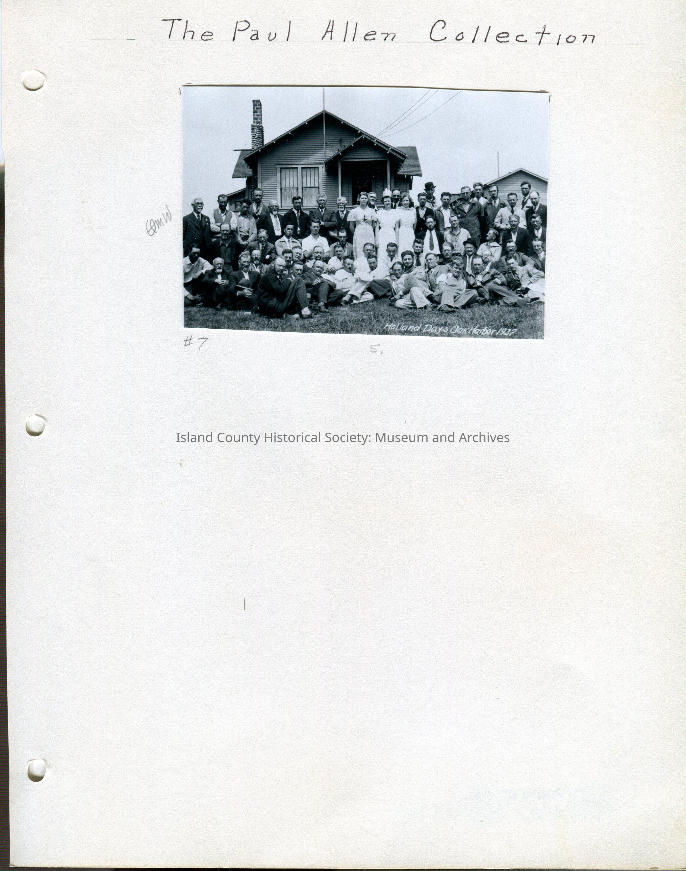 Photo 4.5"W x 3"H - photo of a large group of men standing/sitting on a lawn in front of a house. In the middle of the group are three young women wearing long white dresses. Printed on the photo in the lower right corner: "Holland Days, Oak Harbor 1937."