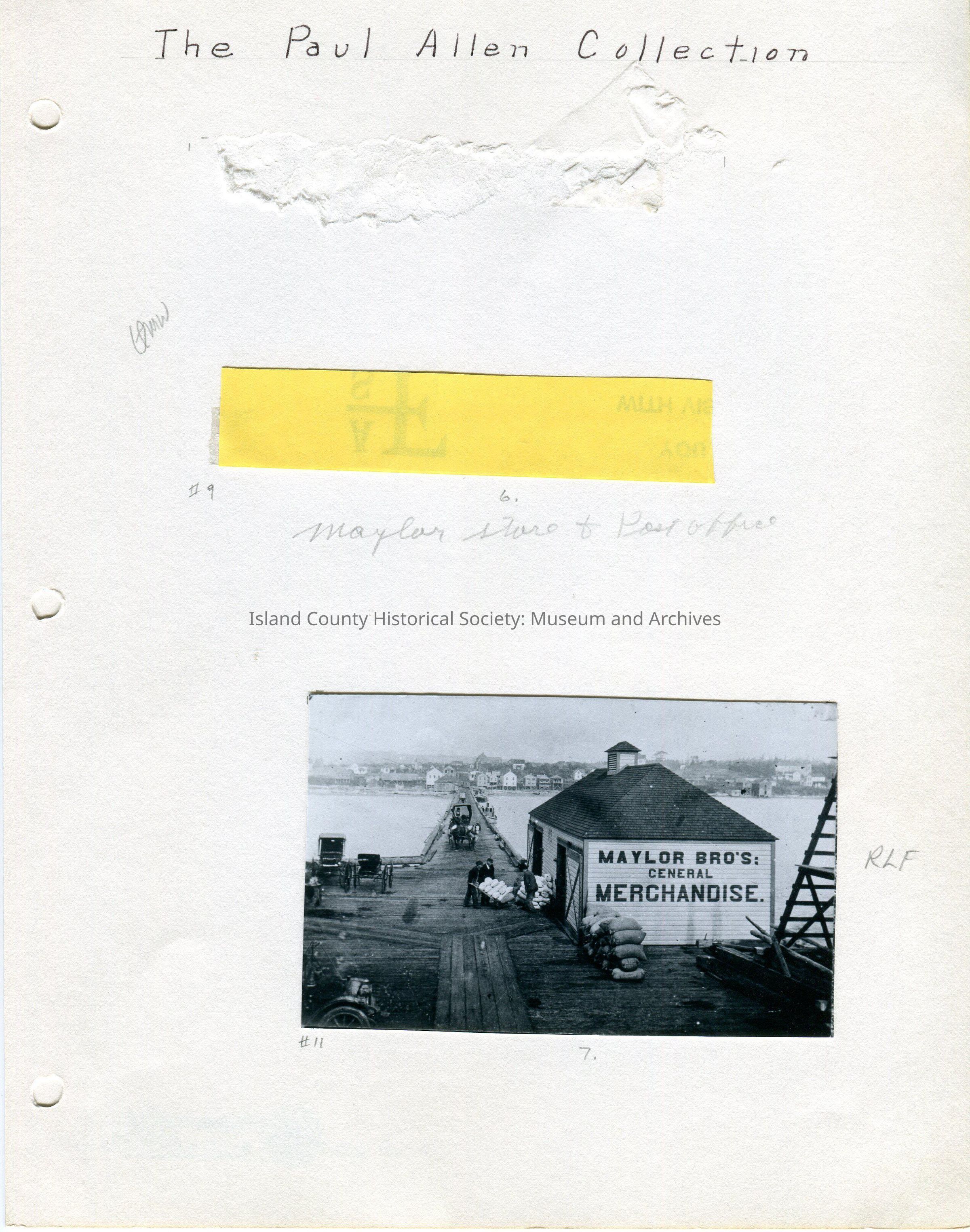 Bottom photo - 4.5" W x 3"H - photo of Maylor Bro's: General Merchandise building on the wharf in Oak Harbor. Yellow sticky note attached to the photo said, "Maylor Wharf, Oak Harbor PCT-8-13".Lexicon