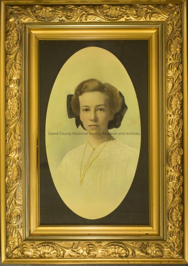 Gold framed color portrait of Alice Coates Sibon. The portrait appears to be enclosed within an oval shaped - black mat. In the photo Alice iw wearing a white blouse and her hair is pinned up into a bow. She is also wearing a gold chainlink necklace in the photo.