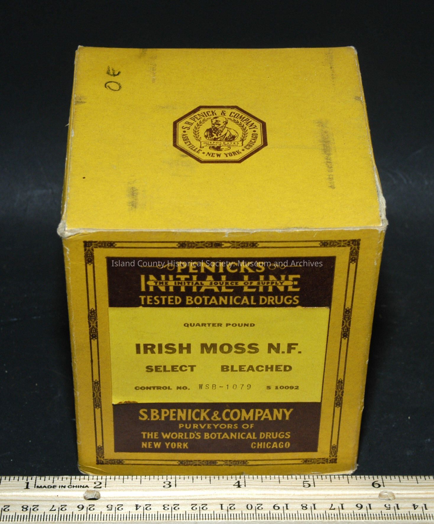 paper box 5" tall x 4"x4" full of Irish Moss N.F. S.B. Penick & Co. Purveyors of the World's Botannical Drugs New York Chicago (full)