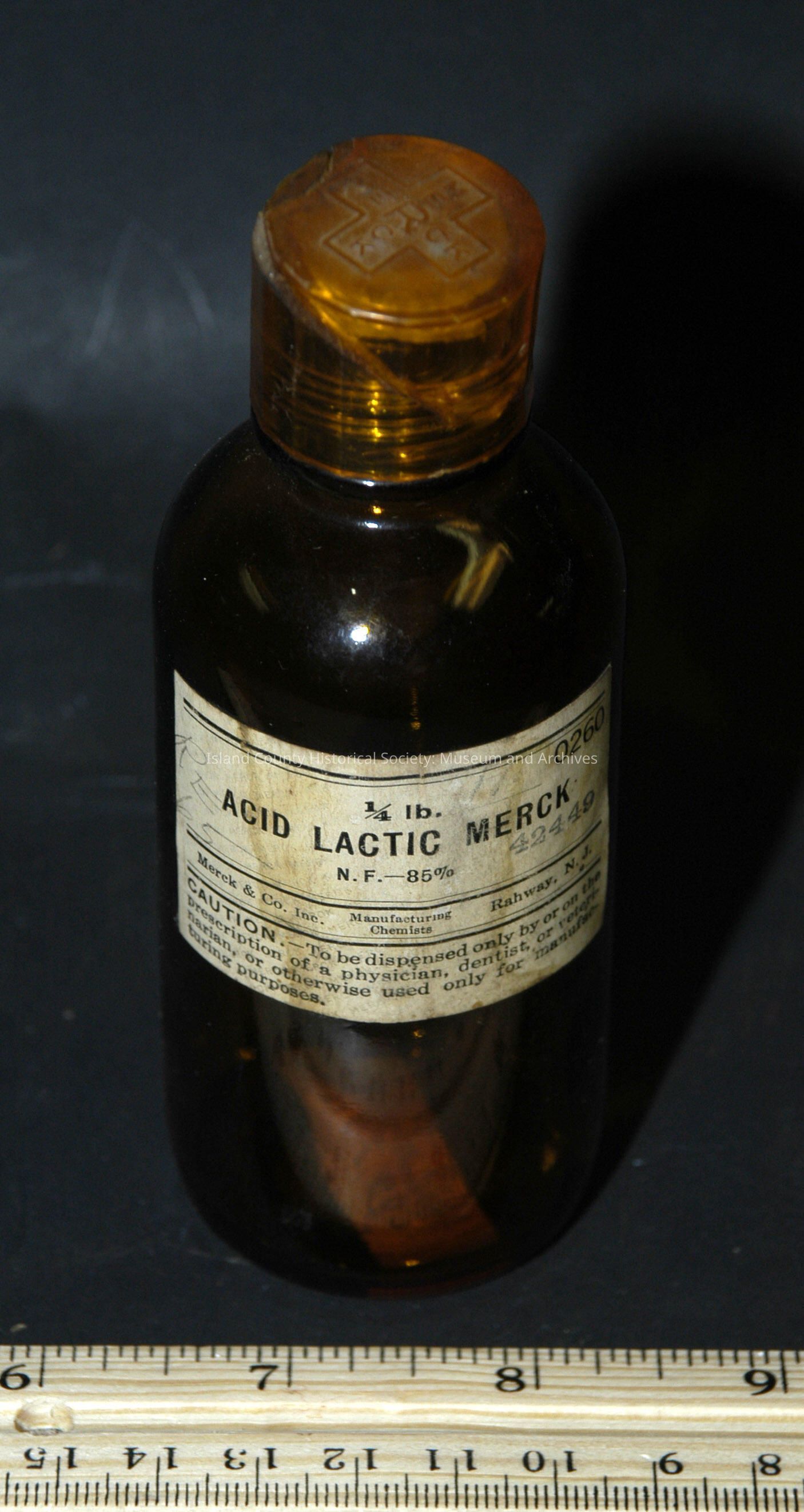 brown 4 1/2" bottle with plastic cap - Acid Lactic Merck 1.4 lb. L 57A U.S. Pat. 2097912 6 H (with downward arrow through it) 5