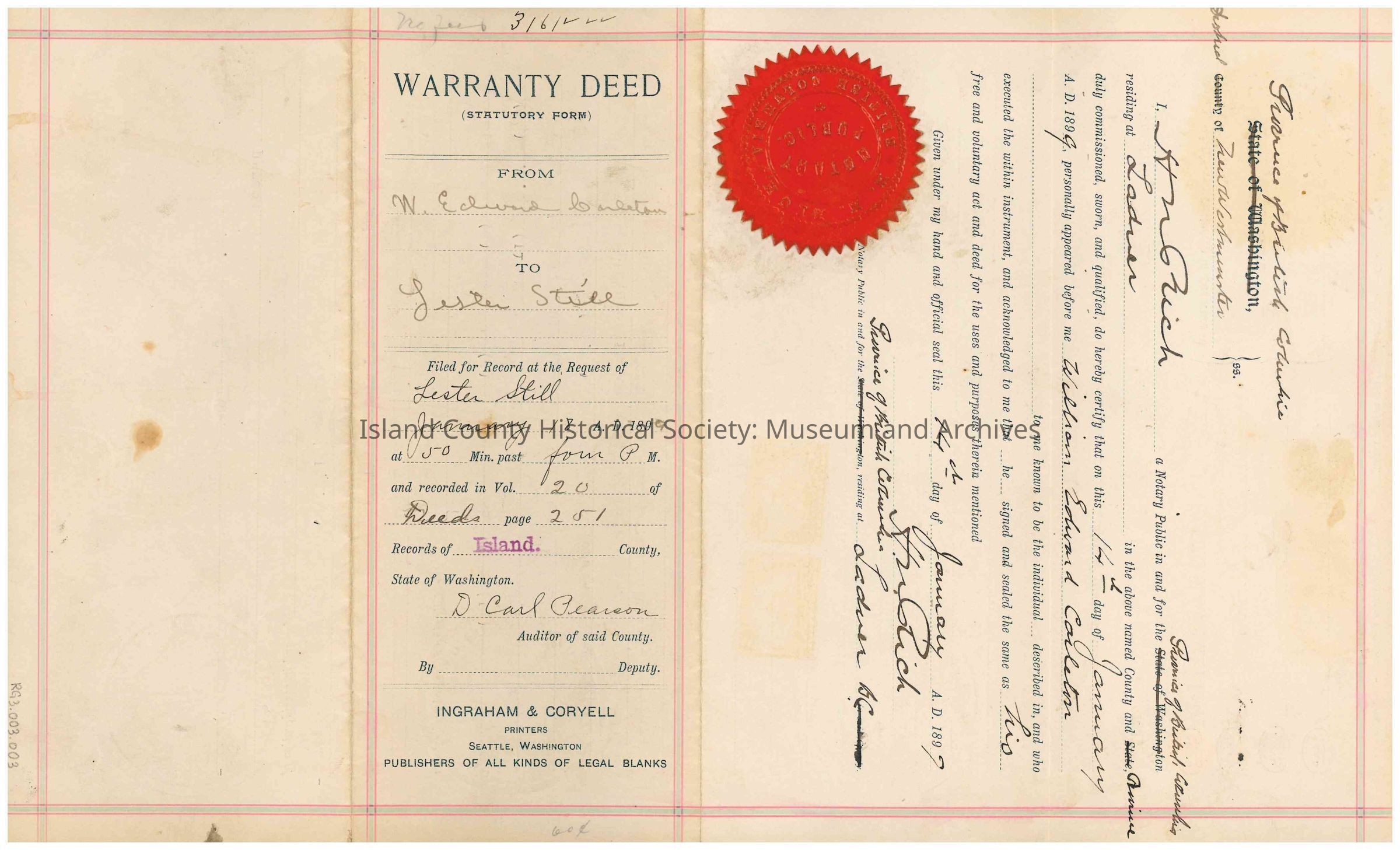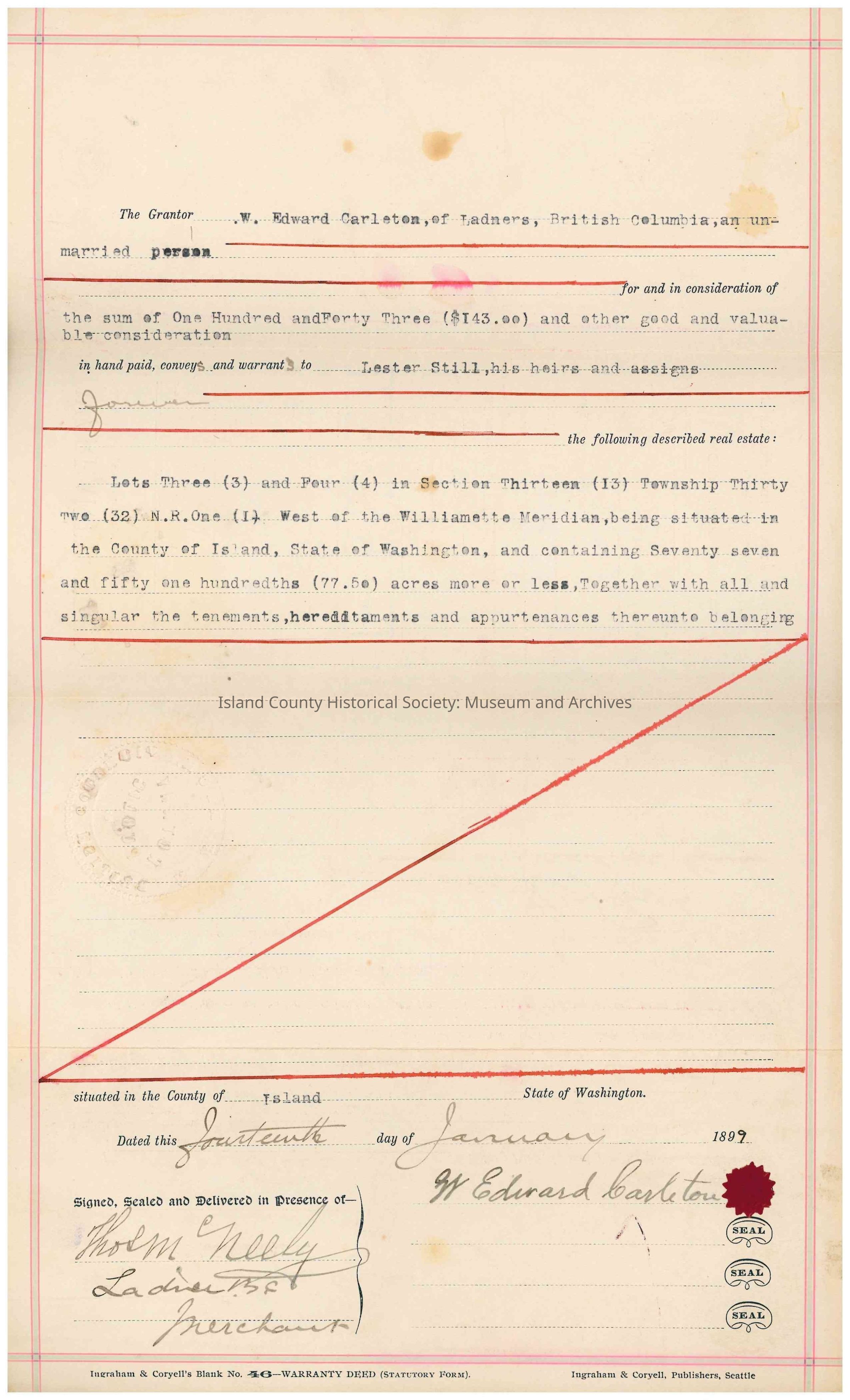 Warranty Deed from W. Edward Carleton to Lester Still, c. 18th January 1889. This Warranty Deed is for the value of $143 dollars and for the following portions of land in Island County: "Lots three (3) and four (4) in Section Thirteen (13) Township Thirty-Two (32) N.R. One (1) West of the Williamette Meridian, being situated in the County of Island, State of Washington, and containing Seventy seven and fifty one hundredths (77.50) acres more or less, Together with all and singular the tements, hereditaments and appurtenances thereunto belonging."Collection