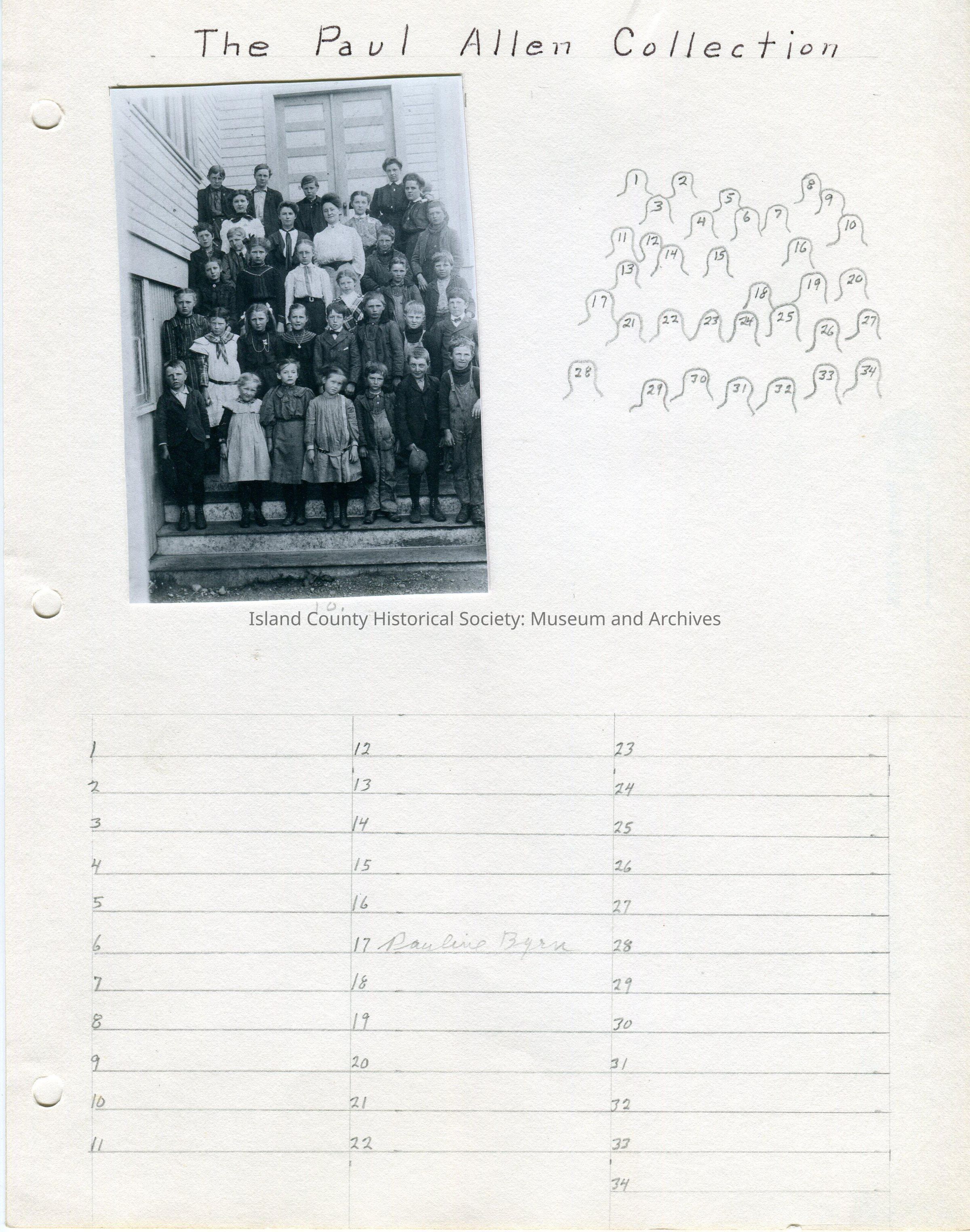 Photo 3"W x 4.5"H - photo of a group of school children (boys and girls) standing on the steps of their school with their teacher. Only one student is identified - #17 - Pauline Byrne