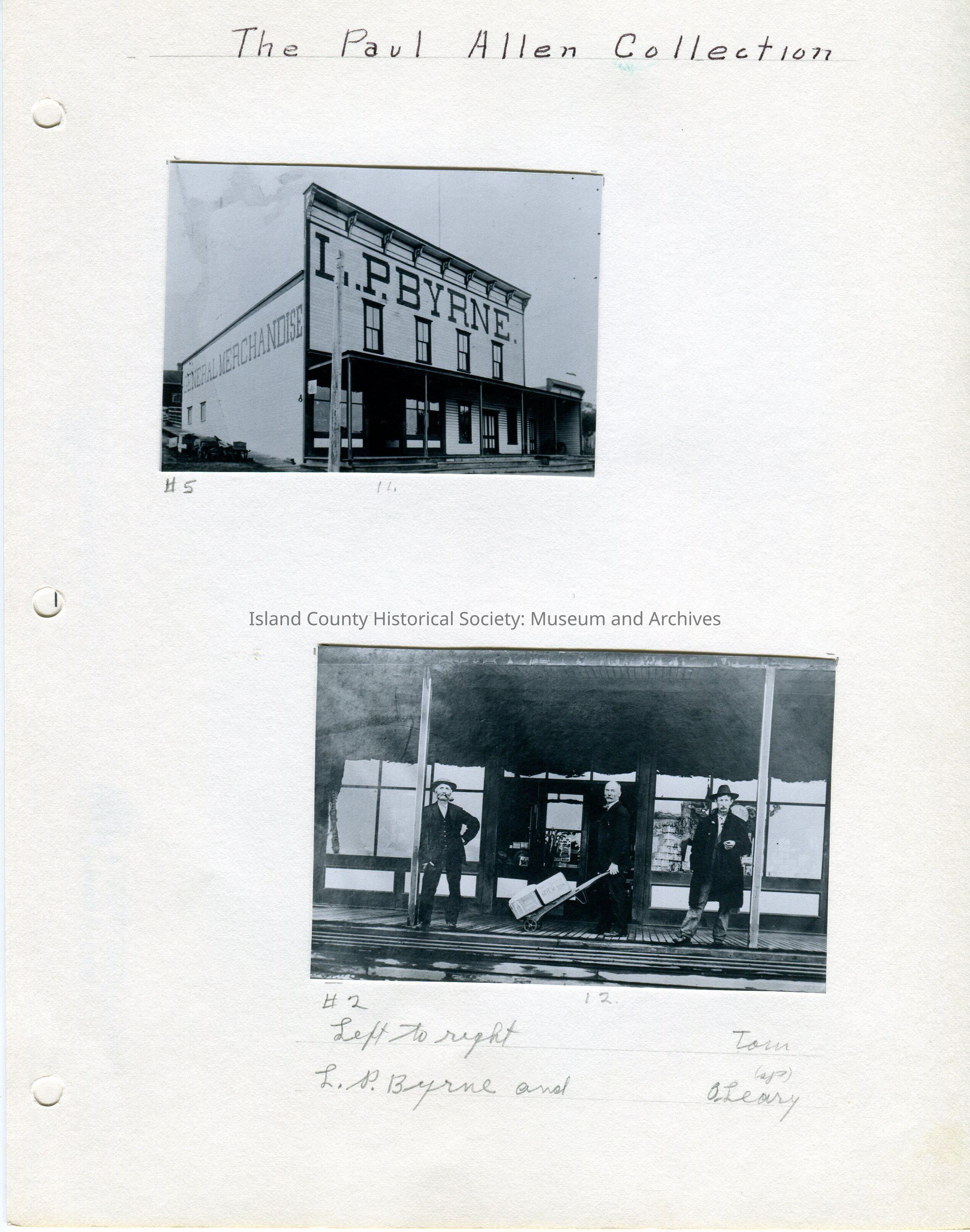Bottom Photo - 4.5"W x 3"H - photo of 3 men standing on the porch of the store. All three men are wearing suits. The man on the left is wearing a hat and smoking a pipe. The man in the middle is hatless and is pushing a cart with two large crates on it. The man on the right is wearing a hat and long coat. Under the photo is written Left to Right: Tom, L.P. Byrne and O"Leary. However, there was a yellow sticky note on the album page that said something different: " L to R - Jerome Ely, Byrne, Maurice O'Leary PCT 8-13."Lexicon