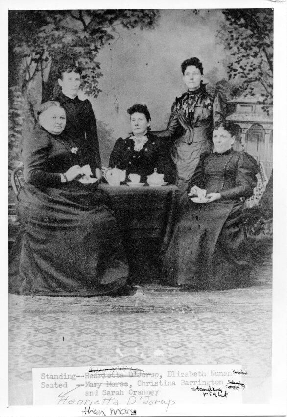 Group of five women seated around a small table having tea. This looks to be a studio posed shot most likely. All the women are wearing 1850's style dresses.