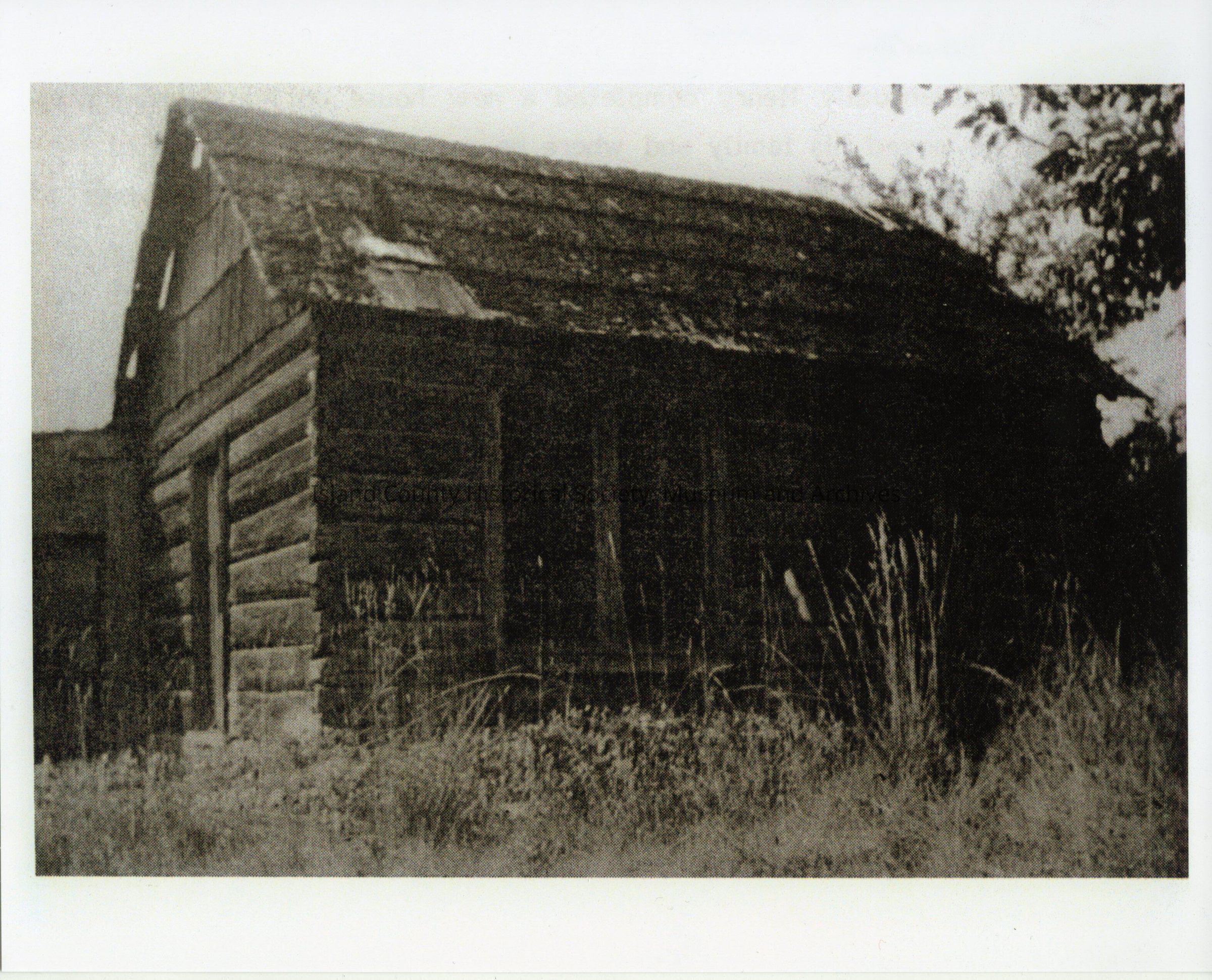Clinton School - 1890s. It is a small log building with a double window visible on front and door on side. Lean-to or another building visible at side. Tall weeds in front.